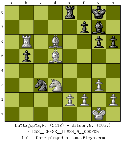 Last move : 1-0 2019 May 14 17:0:52 [Event "FICGS__CHESS__CLASS_A__000205"] [Site "FICGS"] [Date "2019.01.26"] [Round "1"] [White "Duttagupta,Aniruddha"] [Black "Wilson,Norman"] [Result "1-0"] [WhiteElo "2112"] [BlackElo "2057"] 1.d4 Nf6 2.c4 e6 3.g3 c5 4.d5 exd5 5.cxd5 d6 6.Nc3 g6 7.Bg2 Bg7 8.Nf3 O-O 9.O-O a6 10.a4 Nbd7 11.Bf4 Qc7 12.Qd2 Re8 13.Rfc1 Rb8 14.b4 b5 15.Rab1 bxa4 16.Nxa4 Ne4 17.Qc2 h6 18.Ne1 Ndf6 19.bxc5 Rxb1 20.Qxb1 Qa5 21.Nb6 Bf5 22.Nc4 Qxc5 23.Nd3 Qb5 24.Qxb5 axb5 25.Ne3 Bc8 26.Rc6 Bb7 27.Rb6 Bxd5 28.Bxd6 Nc3 29.Nxd5 Nfxd5 30.Bxd5 1-0 Catalan Opening Kingside Castling by player Black (move 8) Kingside Castling by player White (move 9) Player White won this chess game. Follow this game move after move (download)Bobby just drops the pieces and they fall on the right squares. (Miguel Najdorf) Frage: Gibt es etwas was Sie mehr lieben als Autobahnen ohne Tempobegrenzungen? - Antwort: Deutsche Frauen ohne Tempobegrenzungen. (Loek van Wely) Aunque la mayoría de la gente disfruta observar las partidas de los grandes Maestros de ataque, algunos de los jugadores mas notables en la historia han sido los jugadores silenciosos posicionales. Lentamente ellos te aplastan despojandote de tu espacio, congestionando tus piezas y dejandote virtualmente sin nada que hacer. (Yasser Seirawan) Mais n'est-ce pas déjà le limiter injurieusement que d'appeler les échecs un jeu? N'est-ce pas aussi une science, un art, ou quelque chose qui, comme le cercueil de Mahomet entre ciel et terre, est suspendu entre l'un et l'autre, et qui réunit un nombre incroyable de contraires ? (Stefan Zweig) Political correctness is subjecting us to gross incompetence. (Johann Piek)