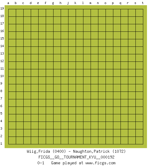 Last move : 0-1 2019 February 25 21:25:50 [Event "FICGS__GO__TOURNAMENT_KYU__000192"] [Site "FICGS"] [Date "2019.01.26"] [Round "1"] [Black "Wiig,Frida"] [White "Naughton,Patrick"] [Result "0-1"] [Rating 1 "0400"] [Rating 2 "1072"] 0-1 This go game has been lost on time (started : 2019.01.26 16:1:10) Here are the names of the openings (joseki) played in the four corners : Player White won this Go (weiqi, baduk) game. Follow this game move after move (download)Always remember, keep the balance. [between territory and influence] (Figaro) Art is not a thing, it is a way. (Elbert Hubbard)