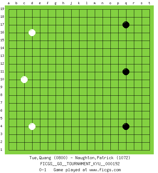 Last move : 0-1 2019 March 1 10:0:15 [Event "FICGS__GO__TOURNAMENT_KYU__000192"] [Site "FICGS"] [Date "2019.01.26"] [Round "1"] [Black "Tue,Quang"] [White "Naughton,Patrick"] [Result "0-1"] [Rating 1 "0800"] [Rating 2 "1072"] 1.q4 d4 2.q17 d16 3.q11 c10 0-1 This go game has been lost on time (started : 2019.01.26 16:1:10) Here are the names of the openings (joseki) played in the four corners : Corner d4 : d4 0-1 Hoshi (Hwajeom, Seongjeom, Xingwei`) 4-4 Point. The star or hoshi (4-4) point, emphasizing influence at the potential expense of territory. Player White won this Go (weiqi, baduk) game. Follow this game move after move (download)Atari, atari is vulgar play. (Anonymous) Coffee just isn't my cup of tea. (Unknown)