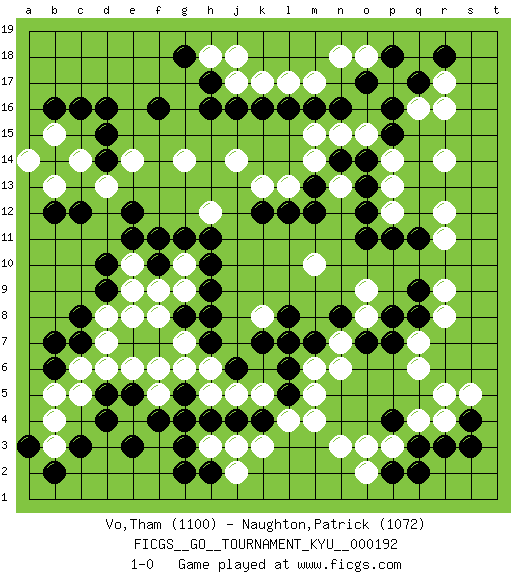 Last move : 1-0 2019 February 7 18:9:48 [Event "FICGS__GO__TOURNAMENT_KYU__000192"] [Site "FICGS"] [Date "2019.01.26"] [Round "1"] [Black "Vo,Tham"] [White "Naughton,Patrick"] [Result "1-0"] [Rating 1 "1100"] [Rating 2 "1072"] 1.d4 q4 2.d16 q16 3.o17 r14 4.k16 c14 5.c12 e14 6.f16 g14 7.e12 h12 8.g11 c6 9.c8 e6 10.f4 b4 11.c3 b3 12.b2 h3 13.h4 j3 14.g3 n3 15.j4 k3 16.k4 l4 17.l5 m4 18.b7 d8 19.d9 e8 20.c7 d7 21.b6 c5 22.d5 d6 23.g8 e9 24.d10 g7 25.h7 g9 26.h9 g10 27.h10 f8 28.h8 g6 29.f10 f9 30.h11 e10 31.e11 e4 32.e5 f5 33.g5 f6 34.e3 h6 35.j6 b5 36.a3 q7 37.r3 r4 38.q3 p3 39.p2 o2 40.p4 o3 41.s4 s5 42.s3 r5 43.q2 r11 44.h16 m17 45.m16 l17 46.l16 o18 47.p18 n18 48.q17 r17 49.r18 j17 50.j16 k17 51.h17 h18 52.g18 j18 53.b16 j14 54.p16 r16 55.h2 j2 56.g2 m10 57.k12 k13 58.l12 l13 59.m13 m14 60.n14 n13 61.m12 n15 62.o14 m15 63.n16 o15 64.p15 p14 65.o13 p13 66.o12 p12 67.o11 o9 68.p11 n7 69.q11 r12 70.q9 r9 71.q8 r8 72.p7 q6 73.p8 m5 74.l6 m6 75.l8 l7 76.k7 k5 77.m7 j5 78.n8 o8 79.o7 h5 80.g4 n6 81.f11 k8 82.l7 b13 83.b12 b15 84.c16 a14 85.d14 d13 86.d15 1-0 Here are the names of the openings (joseki) played in the four corners : Corner q16 : q16 o17 Hoshi (Hwajeom, Seongjeom, Xingwei`) 4-4 Point. The star or hoshi (4-4) point, emphasizing influence at the potential expense of territory. Ikken Kakari (Hankan Keolch'im, Yi Gua`jiao~, 1-Space Low Approach). Black 2 is the standard approach move to the 4-4. Corner d16 : d16 c14 Hoshi (Hwajeom, Seongjeom, Xingwei`) 4-4 Point. The star or hoshi (4-4) point, emphasizing influence at the potential expense of territory. Ikken Kakari (Hankan Keolch'im, Yi Gua`jiao~, 1-Space Low Approach). White 2 is the standard approach move to the 4-4. Corner d4 : d4 c6 Hoshi (Hwajeom, Seongjeom, Xingwei`) 4-4 Point. The star or hoshi (4-4) point, emphasizing influence at the potential expense of territory. Ikken Kakari (Hankan Keolch'im, Yi Gua`jiao~, 1-Space Low Approach). White 2 is the standard approach move to the 4-4. Player Black won this Go (weiqi, baduk) game. Follow this game move after move (download)Those who are good at winning, don't usually fight. (Zhang) Warrior pose battles inner weakness and wins focus. You see that there is no war within you. You're on your own side, and you are your own strength. (Terri Guillemets)
