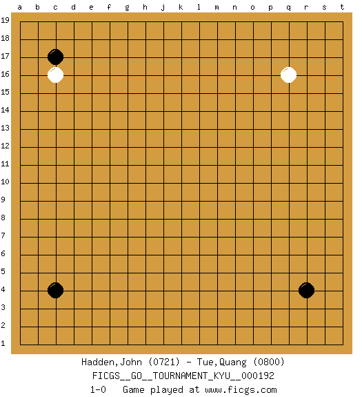 Last move : 1-0 2019 March 3 22:11:21 [Event "FICGS__GO__TOURNAMENT_KYU__000192"] [Site "FICGS"] [Date "2019.01.26"] [Round "1"] [Black "Hadden,John"] [White "Tue,Quang"] [Result "1-0"] [Rating 1 "0721"] [Rating 2 "0800"] 1.c4 q16 2.r4 c16 3.c17 1-0 This go game has been lost on time (started : 2019.01.26 16:1:10) Here are the names of the openings (joseki) played in the four corners : Corner d16 : c16 c17 Komoku (Somok, Xiao~mu`) 3-4 Point. The komoku (3-4) point is the traditional corner enclosure move.. This is not joseki. n invasion to take the corner after White made a shimari-less moyo on top disabling the other moves. Corner d4 : c4 1-0 Komoku (Somok, Xiao~mu`) 3-4 Point. The komoku (3-4) point is the traditional corner enclosure move.. Player Black won this Go (weiqi, baduk) game. Follow this game move after move (download)More haste less speed. (John Fairbairn) That's absurd. I love it. (Gregory House, House M.D.)