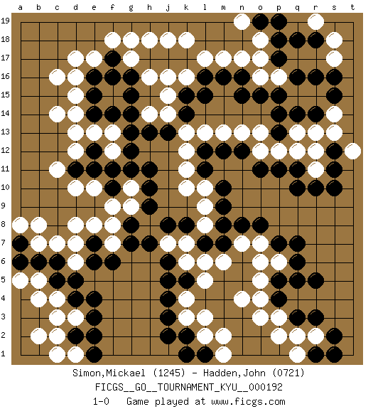 Last move : 1-0 2019 July 16 21:58:38 [Event "FICGS__GO__TOURNAMENT_KYU__000192"] [Site "FICGS"] [Date "2019.01.26"] [Round "1"] [Black "Simon,Mickael"] [White "Hadden,John"] [Result "1-0"] [Rating 1 "1245"] [Rating 2 "0721"] 1.r16 c16 2.q3 c4 3.p17 k16 4.r5 k4 5.e16 e17 6.f17 d17 7.f14 h16 8.e14 c14 9.r10 n17 10.o15 n4 11.e3 d3 12.e4 d8 13.j3 k3 14.j4 l6 15.c5 b4 16.d4 c3 17.c6 c7 18.k2 l2 19.j2 g17 20.f16 f18 21.k5 l5 22.j5 p3 23.p4 o3 24.k8 o6 25.q7 d10 26.m16 m17 27.l16 l17 28.k15 j15 29.k14 h14 30.d11 c11 31.f11 d12 32.e11 f13 33.e12 e13 34.g13 d13 35.g14 f9 36.h11 e10 37.e7 d7 38.e6 b5 39.b6 b7 40.a7 a8 41.a6 b8 42.h13 j14 43.j13 l3 44.h17 h18 45.j17 j18 46.g16 g18 47.n8 n7 48.o8 e8 49.g7 o4 50.p5 o5 51.n16 o17 52.p18 o18 53.h9 q2 54.r3 r2 55.s2 d14 56.d2 c2 57.e2 b2 58.m7 m6 59.l7 p6 60.q6 o7 61.k17 k18 62.r1 p2 63.l1 m1 64.k1 m2 65.f10 d6 66.d5 f7 67.f6 f8 68.h7 g10 69.g11 g9 70.h10 q1 71.s1 a5 72.q5 j16 73.o19 n19 74.p19 o16 75.p15 p16 76.q16 k6 77.j6 k7 78.j8 j7 79.g8 d16 80.e15 d15 81.g15 f12 82.g12 d1 83.e1 c1 84.p7 s17 85.s16 s18 86.r18 r19 87.q18 k13 88.l15 l13 89.n15 n13 90.m12 m13 91.n12 o12 92.o11 p12 93.p11 q12 94.q11 r12 95.p13 o13 96.r14 r13 97.q14 s14 98.s15 s13 99.s11 r11 100.q10 k11 101.l12 k12 102.m10 l10 103.m9 l8 104.m8 l9 105.l11 k10 106.s12 t12 107.s10 q13 108.p14 pass 109.pass 1-0 Here are the names of the openings (joseki) played in the four corners : Corner d16 : c16 e16 Komoku (Somok, Xiao~mu`) 3-4 Point. The komoku (3-4) point is the traditional corner enclosure move.. Ikken Takagakari (Hankan Nop'dakeolch'im, Yi Gaogua`jiao~, 1-Space High Approach). The 5-4 approach move has become more popular in modern times, as modern Go emphasizes speed and influence. Corner d4 : c4 e3 Komoku (Somok, Xiao~mu`) 3-4 Point. The komoku (3-4) point is the traditional corner enclosure move.. Ikken Kakari (Hankan Keolch'im, Yi Gua`jiao~, 1-Space Low Pincer). The small knight move is the basic approach move to the 3-4 point stone. It has been continually used for over four centuries. There are limitless variations, with new moves constantly being discovered. Black 2 opens the door to a treaure store of joseki. Player Black won this Go (weiqi, baduk) game. Follow this game move after move (download)The possibility or impossibility of an event results logically from the rules. (Pierre Audouard) Hold em is to stud what chess is to checkers. (Johnny Moss)