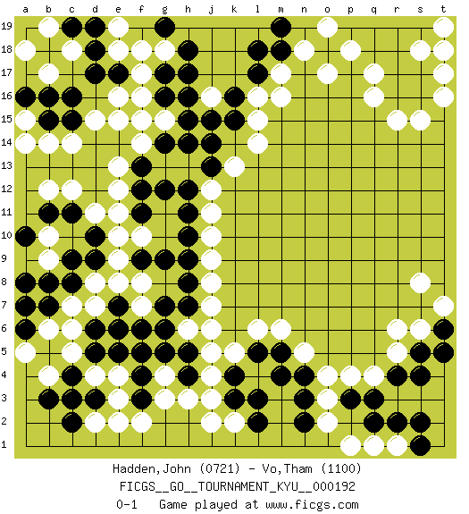 Last move : 0-1 2019 June 9 1:6:37 [Event "FICGS__GO__TOURNAMENT_KYU__000192"] [Site "FICGS"] [Date "2019.01.26"] [Round "1"] [Black "Hadden,John"] [White "Vo,Tham"] [Result "0-1"] [Rating 1 "0721"] [Rating 2 "1100"] 1.c4 q16 2.r4 p4 3.p3 o3 4.q3 o4 5.d17 r5 6.s5 r6 7.l3 s6 8.s4 d15 9.c15 c14 10.c16 e3 11.d3 e4 12.d9 c5 13.d5 d4 14.c3 c6 15.e6 d2 16.c2 e2 17.d6 c7 18.c8 d7 19.e7 d8 20.c9 e8 21.g7 f8 22.f5 h3 23.h4 j3 24.k3 j4 25.n3 o2 26.n4 n5 27.m5 m6 28.l5 l6 29.k4 j5 30.h5 h6 31.g6 g4 32.g5 j7 33.h7 j6 34.h8 f10 35.h10 d11 36.c11 c12 37.b11 b12 38.d10 e11 39.b7 b6 40.b8 b10 41.a10 a7 42.a8 b9 43.a6 a5 44.a7 b4 45.b3 j9 46.h9 j10 47.f9 e9 48.g9 e10 49.h12 j11 50.h11 k13 51.k16 m17 52.l17 m16 53.m18 n18 54.l18 o17 55.j14 l14 56.f15 e16 57.e17 f16 58.g16 f17 59.g17 g18 60.h18 e18 61.d18 g15 62.g14 h15 63.h16 j16 64.h17 f14 65.j15 e15 66.h14 b14 67.b15 a15 68.a16 a14 69.g12 b17 70.b16 c18 71.c19 b19 72.d19 e19 73.a19 a18 74.f15 g15 75.f13 e13 76.n2 q1 77.r2 r1 78.s1 p1 79.s2 k2 80.l2 j2 81.r16 r15 82.r17 s15 83.s16 q17 84.q18 p18 85.r18 s18 86.s19 t18 87.s17 q19 88.g19 f18 89.r19 t16 90.p19 o19 91.q19 t17 92.m19 t19 93.t6 t7 94.t5 s8 95.f11 e12 96.f12 q4 97.q2 k5 98.m4 l16 99.k15 l15 100.j13 j12 101.f4 g3 102.f3 f2 103.e5 f7 104.f6 j8 105.h15 f15 0-1 Here are the names of the openings (joseki) played in the four corners : Corner q4 : r4 p4 Komoku (Somok, Xiao~mu`) 3-4 Point. The komoku (3-4) point is the traditional corner enclosure move.. Ikken Takagakari (Hankan Nop'dakeolch'im, Yi Gaogua`jiao~, 1-Space High Approach). The 5-4 approach move has become more popular in modern times, as modern Go emphasizes speed and influence. Corner d16 : d17 d15 Komoku (Somok, Xiao~mu`) 3-4 Point. The komoku (3-4) point is the traditional corner enclosure move.. Ikken Takagakari (Hankan Nop'dakeolch'im, Yi Gaogua`jiao~, 1-Space High Approach). The 5-4 approach move has become more popular in modern times, as modern Go emphasizes speed and influence. Corner d4 : c4 e3 Komoku (Somok, Xiao~mu`) 3-4 Point. The komoku (3-4) point is the traditional corner enclosure move.. Ikken Kakari (Hankan Keolch'im, Yi Gua`jiao~, 1-Space Low Pincer). The small knight move is the basic approach move to the 3-4 point stone. It has been continually used for over four centuries. There are limitless variations, with new moves constantly being discovered. White 2 opens the door to a treaure store of joseki. Player White won this Go (weiqi, baduk) game. Follow this game move after move (download)In the corner, five stones in a row on the third line are alive. (Anonymous) Luck is when opportunity knocks and you answer. (Anonymous)