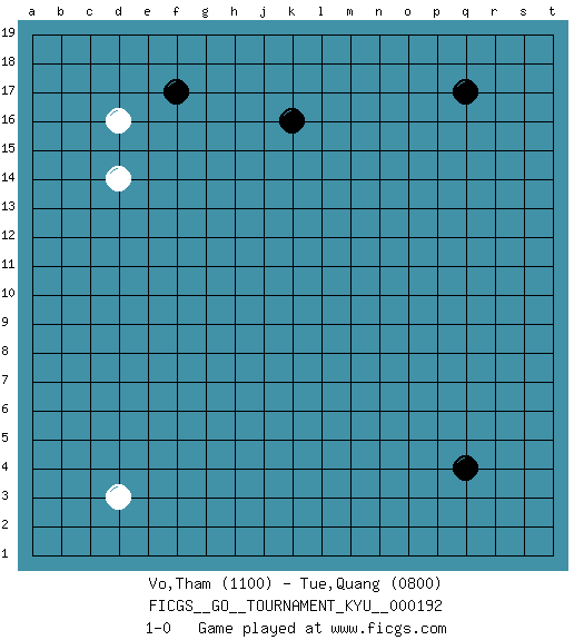 Last move : 1-0 2019 March 1 22:1:26 [Event "FICGS__GO__TOURNAMENT_KYU__000192"] [Site "FICGS"] [Date "2019.01.26"] [Round "1"] [Black "Vo,Tham"] [White "Tue,Quang"] [Result "1-0"] [Rating 1 "1100"] [Rating 2 "0800"] 1.q4 d16 2.q17 d3 3.f17 d14 4.k16 1-0 This go game has been lost on time (started : 2019.01.26 16:1:10) Here are the names of the openings (joseki) played in the four corners : Corner d16 : d16 f17 Hoshi (Hwajeom, Seongjeom, Xingwei`) 4-4 Point. The star or hoshi (4-4) point, emphasizing influence at the potential expense of territory. Ikken Kakari (Hankan Keolch'im, Yi Gua`jiao~, 1-Space Low Approach). Black 2 is the standard approach move to the 4-4. Player Black won this Go (weiqi, baduk) game. Follow this game move after move (download)Fighting must not be the key to go, it should be reserved as your last resource. (Zhong-Pu Liu, about Weiqi) Plans are ideas that never come to fruition. (Daniel Parmet)