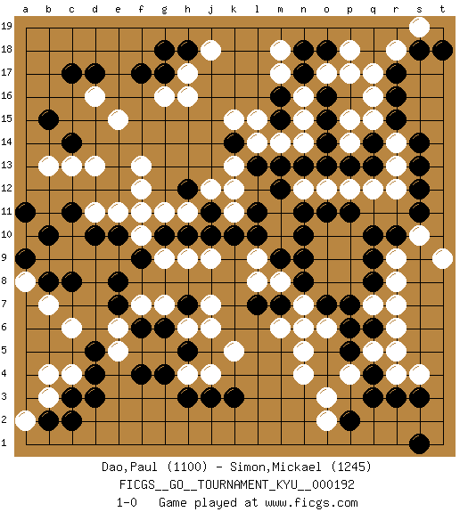 Last move : 1-0 2019 April 4 23:39:31 [Event "FICGS__GO__TOURNAMENT_KYU__000192"] [Site "FICGS"] [Date "2019.01.26"] [Round "1"] [Black "Dao,Paul"] [White "Simon,Mickael"] [Result "1-0"] [Rating 1 "1100"] [Rating 2 "1245"] 1.d4 q16 2.r17 q17 3.r16 r14 4.r15 q15 5.s14 d16 6.q4 c6 7.c14 o3 8.f17 e15 9.c17 d13 10.d17 g16 11.g17 h16 12.c11 c13 13.c8 e6 14.g4 h6 15.e8 b4 16.c3 r6 17.q6 q7 18.p6 r4 19.r3 r5 20.q3 n4 21.n6 r8 22.k3 m6 23.p7 n7 24.q9 r9 25.m7 n5 26.n8 o6 27.l7 k5 28.o7 n6 29.q8 r7 30.q10 h17 31.b15 b13 32.f11 k11 33.g6 g7 34.f6 f7 35.e7 e5 36.f4 b3 37.b2 c4 38.d3 b7 39.b8 a2 40.c2 m8 41.n9 l8 42.d5 m17 43.r10 s10 44.s11 t9 45.q14 r13 46.s13 r12 47.s12 p14 48.q13 q12 49.p13 p12 50.o13 o12 51.o14 n12 52.o16 p15 53.o15 p18 54.o18 r18 55.s18 s19 56.t18 o17 57.n17 p17 58.n18 n16 59.m16 n15 60.m15 n14 61.n13 m14 62.m13 l14 63.l13 m18 64.l11 m11 65.l10 m10 66.m9 l9 67.k10 j9 68.j10 h9 69.k14 l15 70.h10 g9 71.m12 k15 72.n11 k13 73.n10 k12 74.o11 f13 75.p11 d11 76.d10 e11 77.e10 j4 78.j3 q5 79.p5 p4 80.p2 o2 81.s3 s4 82.s1 a10 83.b10 a8 84.a11 f10 85.a9 g11 86.h12 h11 87.j11 j12 88.g10 f12 89.f9 f11 90.h7 j7 91.h5 j6 92.h18 j18 93.g18 h4 94.h3 1-0 Here are the names of the openings (joseki) played in the four corners : Corner q16 : q16 r17 Hoshi (Hwajeom, Seongjeom, Xingwei`) 4-4 Point. The star or hoshi (4-4) point, emphasizing influence at the potential expense of territory. Corner d4 : d4 c6 Hoshi (Hwajeom, Seongjeom, Xingwei`) 4-4 Point. The star or hoshi (4-4) point, emphasizing influence at the potential expense of territory. Ikken Kakari (Hankan Keolch'im, Yi Gua`jiao~, 1-Space Low Approach). White 2 is the standard approach move to the 4-4. Corner d16 : d16 c14 Hoshi (Hwajeom, Seongjeom, Xingwei`) 4-4 Point. The star or hoshi (4-4) point, emphasizing influence at the potential expense of territory. Ikken Kakari (Hankan Keolch'im, Yi Gua`jiao~, 1-Space Low Approach). Black 2 is the standard approach move to the 4-4. Corner q4 : q4 o3 Hoshi (Hwajeom, Seongjeom, Xingwei`) 4-4 Point. The star or hoshi (4-4) point, emphasizing influence at the potential expense of territory. Ikken Kakari (Hankan Keolch'im, Yi Gua`jiao~, 1-Space Low Approach). White 2 is the standard approach move to the 4-4. Player Black won this Go (weiqi, baduk) game. Follow this game move after move (download)If you have lost four corners, resign. (Anonymous) Life is painting a picture, not doing a sum. (Oliver Wendell Holmes, Jr.)