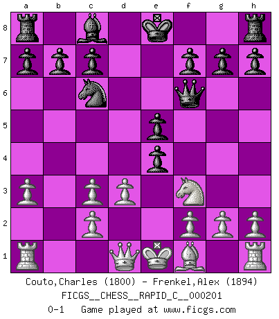 Last move : 0-1 2019 March 10 10:34:1 [Event "FICGS__CHESS__RAPID_C__000201"] [Site "FICGS"] [Date "2019.01.27"] [Round "1"] [White "Couto,Charles"] [Black "Frenkel,Alex"] [Result "0-1"] [WhiteElo "1800"] [BlackElo "1894"] 1.e4 e5 2.Nf3 Nc6 3.Nc3 Nf6 4.d3 d5 5.Bg5 Bb4 6.a3 Bxc3+ 7.bxc3 dxe4 8.Bxf6 Qxf6 0-1 This chess game has been lost on time (started : 2019.01.27 1:54:27) Four knights game Player Black won this chess game. Follow this game move after move (download)As one by one I mowed them down, my superiority soon became apparent. (Jose Capablanca) Wenn ein Kopf und ein Buch zusammenstoßen und es klingt hohl, ist es denn allemal im Buche? (Georg Christoph Lichtenberg) Hay jugadores fuertes y personas amables y yo soy un jugador fuerte. (Bobby Fischer) Votre prénom est 'Tactique', votre deuxième prénom est 'Tactique' et votre nom est 'Tactique'. (Ken Smith) To send light into the darkness of men's hearts - such is the duty of the artist. (Schumann)