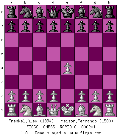 Last move : 1-0 2019 February 26 9:26:25 [Event "FICGS__CHESS__RAPID_C__000201"] [Site "FICGS"] [Date "2019.01.27"] [Round "1"] [White "Frenkel,Alex"] [Black "Yeison,Fernando"] [Result "1-0"] [WhiteElo "1894"] [BlackElo "1500"] 1.e4 1-0 This chess game has been lost on time (started : 2019.01.27 1:54:27) King's pawn Opening Player White won this chess game. Follow this game move after move (download)Chess is the art which expresses the science of logic. (Mikhail Botvinnik) Ich rechne überhaupt nicht voraus. Ich gewinne auch so. (Robert James Fischer) Las ideas audaces son como las piezas del Ajedrez que avanzan hacia adelante. Ellas pueden ser vencidas, pero también pueden iniciar una partida victoriosa. (Goethe) L'action d'une oeuvre littéraire se déroule sur un champ de bataille. Les masques et les types du drame moderne correspondent aux pièces du jeu d'échecs. L'intrigue correspond aux coups et aux gambits, c'est à dire aux techniques du jeu telles qu'utilisées et interprétées par les joueurs. Les tactiques et les péripéties [mouvements] correspondent aux coups exécutés par l'adversaire. (Viktor Shklovsky) The beginning is the most important part of the work. (Plato)
