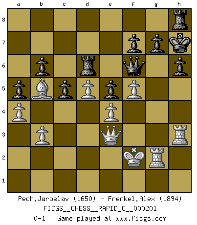 Last move : 0-1 2019 May 14 8:40:44 [Event "FICGS__CHESS__RAPID_C__000201"] [Site "FICGS"] [Date "2019.01.27"] [Round "1"] [White "Pech,Jaroslav"] [Black "Frenkel,Alex"] [Result "0-1"] [WhiteElo "1650"] [BlackElo "1894"] 1.c4 e5 2.Nc3 Nf6 3.Nf3 Nc6 4.g3 Bc5 5.Bg2 O-O 6.O-O Re8 7.d3 h6 8.a3 a5 9.e3 d6 10.b3 Bd7 11.Re1 Qc8 12.Bb2 Bf5 13.Nd5 Nxd5 14.cxd5 Ne7 15.d4 exd4 16.e4 Bg4 17.Bxd4 Bxd4 18.Qxd4 c5 19.Qc3 Ng6 20.a4 b6 21.Nd2 Qd8 22.f4 Ra7 23.f5 Ne5 24.h3 Bh5 25.g4 Bxg4 26.hxg4 Nxg4 27.Qg3 Ne5 28.Nc4 Qf6 29.Ra2 Rae7 30.Qc3 Rb7 31.Re3 Kh8 32.Bf1 Rd8 33.Rg2 R7b8 34.Nxe5 dxe5 35.Bb5 Rd6 36.Rh3 Rbd8 37.Qg3 Rf8 38.Qe3 Kh7 39.Kf2 Rh8 0-1 This chess game has been lost on time (started : 2019.01.27 1:54:27) English Opening Kingside Castling by player Black (move 5) Kingside Castling by player White (move 6) Player Black won this chess game. Follow this game move after move (download)War is the child of passion, passion is the child of narcissism and narcissism is the child. (...) Another game ? (Thibault de Vassal) Er war ein guter Schachspieler, aber ich kann Leute nicht ausstehen, die 'Heil Hitler' rufen (Über Alexander Aljechin). (Miguel Najdorf) Cuando veas una buena jugada, trata de encontrar otra mejor. (Emanuel Lasker) Pour se monter efficace, un Cavalier a besoin d'avant-postes ! Les Cavaliers font les meilleurs bloqueurs de pions passés. You can't play chess if you're groggy from pills. (Anatoly Karpov)
