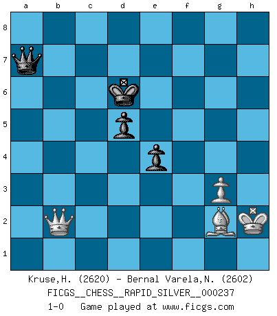 Last move : 1-0 2019 May 12 18:18:30 [Event "FICGS__CHESS__RAPID_SILVER__000237"] [Site "FICGS"] [Date "2019.01.30"] [Round "1"] [White "Kruse,Herbert"] [Black "Bernal Varela,Nelson"] [Result "1-0"] [WhiteElo "2620"] [BlackElo "2602"] 1.Nf3 e6 2.d4 f5 3.g3 Nf6 4.Bg2 g6 5.c4 Bg7 6.Nc3 O-O 7.O-O d6 8.Re1 d5 9.Bf4 c6 10.Rc1 h6 11.b4 g5 12.Be5 Nbd7 13.Bd6 Rf7 14.b5 Ne4 15.bxc6 bxc6 16.Nxe4 fxe4 17.Ne5 Nxe5 18.dxe5 h5 19.f3 g4 20.Rf1 Bh6 21.Rc3 Ba6 22.fxg4 Rxf1+ 23.Qxf1 hxg4 24.cxd5 exd5 25.h4 Qd7 26.Qf6 Bg7 27.Qg5 Bc8 28.a4 Kh7 29.Qh5+ Kg8 30.Kh2 Qf7 31.Qg5 Bd7 32.Rb3 Qf5 33.Qe3 Bxe5 34.Bxe5 Qxe5 35.Rb7 Bc8 36.Rxa7 Rxa7 37.Qxa7 Qg7 38.Qb6 Qb7 39.Qd8+ Kh7 40.Qf8 Qd7 41.a5 Ba6 42.Qa8 Bc8 43.a6 c5 44.a7 Bb7 45.Qf8 c4 46.a8Q Bxa8 47.Qxa8 c3 48.Qf8 Qc6 49.Qf5+ Kg8 50.Qxg4+ Kf7 51.Qf4+ Kg7 52.h5 c2 53.Qc1 Qc5 54.Qg5+ Kf7 55.Qg6+ Ke7 56.Qg7+ Kd6 57.Qf6+ Kc7 58.Qf4+ Kb7 59.Qc1 Qc4 60.h6 Qxe2 61.Qb2+ Kc6 62.h7 Qh5+ 63.Kg1 Qxh7 64.Qxc2+ Kd6 65.Qb2 Qa7+ 66.Kh2 1-0 Reti Opening Kingside Castling by player Black (move 6) Kingside Castling by player White (move 7) Promotion Queen by player White (move 46) 10 pieces endgame at move 60 : White KQBPP , Black KQPPP WHITE : King + 1 Queen 1 Bishop 2 Pawns BLACK : King + 1 Queen 3 Pawns 9 pieces endgame at move 63 : White KQBP , Black KQPPP WHITE : King + 1 Queen 1 Bishop 1 Pawn BLACK : King + 1 Queen 3 Pawns 8 pieces endgame at move 64 : White KQBP , Black KQPP WHITE : King + 1 Queen 1 Bishop 1 Pawn BLACK : King + 1 Queen 2 Pawns Player White won this chess game. Follow this game move after move (download)If cunning alone were needed to excel, women would be the best Chess players. (Albin) Ich hatte Angst gegen einen russischen Großmeister zu verlieren, und er befürchtete gegen einen kleinen Jungen zu verlieren. (über ein Remis gegen Juri Awerbach). (Robert James Fischer) Puntos débiles o agujeros en la posición de tu oponente deben de ser ocupados por piezas, no Peones. (Siegbert Tarrasch) Assurément je connaissais par expérience le mystérieux attrait de ce jeu royal, le seul entre tous les jeux inventés par les hommes qui échappe souverainement à la tyrannie du hasard, le seul où l'on ne doive sa victoire qu'à son intelligence ou plutôt à une certaine forme d'intelligence. Mais n'est-ce pas déjà le limiter injurieusement que d'appeler les échecs un jeu ? N'est-ce pas une science, un art ou quelque chose qui, comme le cercueil de Mahomet entre ciel et terre, est suspendu entre l'un et l'autre, et qui réunit un nombre incroyable de contraires ? [...] C'est une pensée qui ne mène à rien, une mathématique qui n'établit rien, un art qui ne laisse pas d'uvre, une architecture sans matière; et il l'a prouvé néanmoins qu'il était plus durable, à sa manière, que les livres ou que tout autre monument, ce jeu unique qui appartient à tous les peuples et à tous les temps, et dont personne ne sait quel dieu en fit don à la terre pour tuer l'ennui, pour aiguiser l'esprit et stimuler l'âme. Où commence-t-il, où finit-il ? (Stefan Zweig) I think your argument is specious - I think your tie is ugly. (Gregory House to Dr. Foreman, House M.D.)