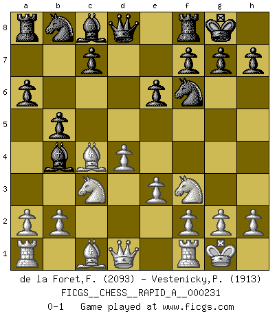 Last move : 0-1 2019 March 12 13:27:37 [Event "FICGS__CHESS__RAPID_A__000231"] [Site "FICGS"] [Date "2019.01.30"] [Round "1"] [White "de la Foret,Fred"] [Black "Vestenicky,Patrik"] [Result "0-1"] [WhiteElo "2093"] [BlackElo "1913"] 1.d4 Nf6 2.c4 e6 3.Nc3 Bb4 4.e3 O-O 5.Bd3 d5 6.Nf3 dxc4 7.Bxc4 a6 8.O-O b5 0-1 Nimzo-Indian : 4.e3 O-O, 5.Bd3 d5 Kingside Castling by player Black (move 4) Kingside Castling by player White (move 8) Player Black won this chess game. Follow this game move after move (download)The winner of the game is the player who makes the next-to-last mistake. (Savielly Tartakover) Mit sehr nachdenklichem Gesicht schreitet Bobby durch den Turniersaal. Was ist passiert?, fragt Lombardy. Ich stehe schlecht, antwortet Fischer. Lombardy: Dann biete doch einfach Remis an. Fischer: So schlecht stehe ich nun auch wieder nicht! (Robert James Fischer) Tu sabes, camarada Pachman, no disfruto el ser un Ministro, preferería jugar al Ajedrez como tu. (Che Guevara) Lorsque vous vous retrouvez devant une position atroce, ne tendez pas un ultime piège dérisoire avec l'intention d'abandonner si l'adversaire le déjoue ! Faites-vous plutôt un devoir de résister comme si votre vie en dépendait. Jouez le coup qui vous déplairait au centuple si vous étiez dans la peau de votre tortionnaire ! Remember : Your focus determines your reality. (Qui-Gon Jinn in Star Wars ep.1)