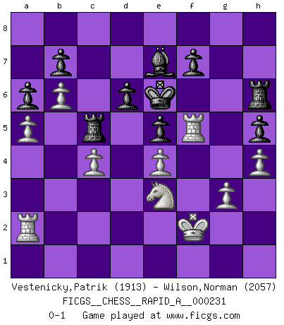 Last move : 0-1 2019 May 7 10:50:36 [Event "FICGS__CHESS__RAPID_A__000231"] [Site "FICGS"] [Date "2019.01.30"] [Round "1"] [White "Vestenicky,Patrik"] [Black "Wilson,Norman"] [Result "0-1"] [WhiteElo "1913"] [BlackElo "2057"] 1.e4 c5 2.Nf3 d6 3.Nc3 Nf6 4.d4 cxd4 5.Qxd4 e5 6.Bb5+ Nbd7 7.Qd3 h6 8.a4 a6 9.Bc4 Nc5 10.Qe2 Qc7 11.O-O Be7 12.b4 Ncd7 13.Bb2 Qb6 14.Ba3 Qc7 15.Nd2 Nb6 16.a5 Nxc4 17.Qxc4 Qd8 18.Na4 Bd7 19.Qb3 Bxa4 20.Qxa4+ Qd7 21.Qxd7+ Kxd7 22.c4 Ke6 23.Bb2 Rac8 24.Ra3 g5 25.Rd3 Rhd8 26.Rb1 g4 27.Ba3 Rd7 28.h4 Ra8 29.b5 Bd8 30.b6 Be7 31.Rd1 Rc8 32.Kf1 R7d8 33.Ke2 Rc6 34.Ke3 Nh5 35.g3 Nf6 36.Rc3 Rdc8 37.Rd3 Rd8 38.Ke2 Nd7 39.f3 gxf3+ 40.Rxf3 Rg8 41.Kd3 Nc5+ 42.Bxc5 Rxc5 43.Ra1 Rg7 44.Nf1 Kd7 45.Ne3 h5 46.Kd2 Ke8 47.Ke2 Kd7 48.Kf2 Ke6 49.Rf5 Rh7 50.Ra2 Rh6 0-1 Sicilian Kingside Castling by player White (move 11) Player Black won this chess game. Follow this game move after move (download)The defensive power of a pinned piece is only imaginary. (Aaron Nimzovich) Der Schachmeister von Heute braucht Courage, einen Killerinstinkt, Ausdauer und Arroganz. (Larry Evans) El Ajedrez es un terrible juego. Si no controlas el centro, tu oponente tiene una posición mas holgada. Si tienes control del centro, ¡entonces realmente tu tienes algo de que preocuparte!. (Siegbert Tarrasch) Ce n'est pas pour s'amuser qu'il joue aux échecs : il célèbre un culte. (Vladimir Nabokov) I couldn't make any sense out of what this particular thread is about. It sounds like R2 D2 computer speaking. A space fight ?!? Some 'command' problems in Moscow ? Some killers & narcotic addicts attacking some game & a god wannabe ?? (Dinesh De Silva, lost in a russian conflict in FICGS forum)