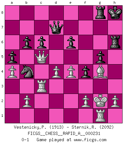 Last move : 0-1 2019 May 29 10:25:11 [Event "FICGS__CHESS__RAPID_A__000231"] [Site "FICGS"] [Date "2019.01.30"] [Round "1"] [White "Vestenicky,Patrik"] [Black "Sternik,Ryszard"] [Result "0-1"] [WhiteElo "1913"] [BlackElo "2092"] 1.d4 Nf6 2.c4 e6 3.g3 d5 4.Bg2 Be7 5.Nf3 O-O 6.O-O dxc4 7.Qc2 a6 8.a4 Bd7 9.Qxc4 Bc6 10.Bf4 Bd6 11.Re1 Bxf4 12.gxf4 Nbd7 13.e3 a5 14.Nc3 Nb6 15.Qb3 Bxf3 16.Bxf3 c6 17.Rec1 Nfd5 18.Ne4 Nb4 19.Qd1 Qe7 20.Nd2 f6 21.Be4 g6 22.Bg2 Rf7 23.Qe2 Rg7 24.Kh1 h6 25.Bh3 f5 26.Rg1 Kh7 27.Nf3 g5 28.fxg5 hxg5 29.Ne5 Rh8 30.e4 Kg8 31.Ra3 f4 32.Rc3 Rh6 33.Bg4 Nd7 34.Qc4 Kh8 35.Nxd7 Qxd7 36.Qc5 Rg8 37.Kg2 b6 0-1 This chess game has been lost on time (started : 2019.01.30 11:10:52) Catalan : Closed, 5.Nf3 Kingside Castling by player Black (move 5) Kingside Castling by player White (move 6) Player Black won this chess game. Follow this game move after move (download)Look at Garry Kasparov. After he loses, invariably he wins the next game. He just kills the next guy. That's something that we have to learn to be able to do. (Maurice Ashley) Du weisst es gibt ein Problem mit Computern und Fernschach, wenn jeder eine Rating von 2450 hat. (John Christen Knudsen) Diferente gente reacciona diferentemente en aceptar la derrota. (Bobby Fischer) Si le désir cupide (et stupide) de gagner est une inépuisable source de souffrance, une combinaison brillante sur l'échiquier est une découverte : le coquelicot qui s'épanouit lorsque apparaît la Voie Lactée. (Arrabal) The arrogant army will lose certainly the battle. (Chinese proverb)