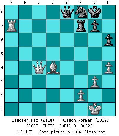 Last move : 1/2-1/2 2019 February 19 11:40:53 [Event "FICGS__CHESS__RAPID_A__000231"] [Site "FICGS"] [Date "2019.01.30"] [Round "1"] [White "Ziegler,Pio"] [Black "Wilson,Norman"] [Result "1/2-1/2"] [WhiteElo "2114"] [BlackElo "2057"] 1.e4 e6 2.d4 d5 3.Nc3 Bb4 4.e5 c5 5.a3 Bxc3+ 6.bxc3 Ne7 7.Qg4 O-O 8.Bd3 Qa5 9.Bd2 Nbc6 10.Nf3 f5 11.exf6 Rxf6 12.Qh5 Nf5 13.c4 Qc7 14.dxc5 Ne5 15.O-O dxc4 16.Be4 Nxf3+ 17.Qxf3 Qxc5 18.Bc3 Rf7 19.Qh5 Bd7 20.Bxb7 Rb8 21.Be4 Bc6 22.Bxc6 Qxc6 23.Qg4 Qc5 24.Rfe1 Ne7 25.Bd4 Qf5 26.Qe4 Ng6 27.Qxe6 Qxc2 28.Rac1 Qd3 29.Qxc4 Qxa3 30.h4 Qb4 31.Re8+ Nf8 32.Rxb8 Qxb8 33.g3 h6 34.Ra1 Qe8 35.Rxa7 1/2-1/2 French : Winawer, Advance, poisoned pawn variation Kingside Castling by player Black (move 7) Kingside Castling by player White (move 15) This chess game ended in a draw. Follow this game move after move (download)A man that will take back a move at Chess will pick a pocket. (Richard Fenton) Ein Springer auf f6 gegen die eigene Rochadestellung ist schlimmer als ein rostiger Nagel im Knie. (Efim Bogoljubov) En el tablero, la mentira e hipocresía no sobreviven mucho. (Emanuel Lasker) Il s'avisa de me proposer d'apprendre les échecs qu'il jouait un peu... me voilà forcené des échecs. J'achète un échiquier, je m'enferme dans ma chambre, j'y passe des jours et des nuits à vouloir apprendre par cur toutes les parties. (Jean-Jacques Rousseau, Confessions) Indecision is the key to flexibility. (Unknown)