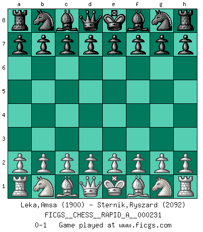 Last move : 0-1 2019 March 1 22:1:26 [Event "FICGS__CHESS__RAPID_A__000231"] [Site "FICGS"] [Date "2019.01.30"] [Round "1"] [White "Leka,Amsa"] [Black "Sternik,Ryszard"] [Result "0-1"] [WhiteElo "1900"] [BlackElo "2092"] 0-1 This chess game has been lost on time (started : 2019.01.30 11:10:52) Player Black won this chess game. Follow this game move after move (download)There just isn't enough televised Chess. (David Letterman) Kein Großmeister ist normal. Sie unterscheiden sich nur im Ausmaß Ihrer Verrücktheit. (Viktor Kortschnoi) Me dio la sensación de como si yo estuviera jugando en contra del mismo Ajedrez. - al estar jugando en contra de Robert Fischer (Walter Shipman) Des points faibles ou des trous dans la position de l'adversaire doivent être occupés par des pièces et non pas par des pions. (Siegbert Tarrasch) Memory is a way of holding onto the things you love, the things you are, the things you never want to lose. (from the television show: The Wonder Years)