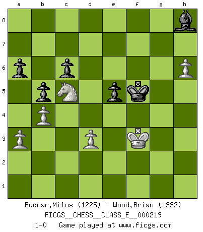 Last move : 1-0 2019 May 5 8:50:9 [Event "FICGS__CHESS__CLASS_E__000219"] [Site "FICGS"] [Date "2019.01.30"] [Round "1"] [White "Budnar,Milos"] [Black "Wood,Brian"] [Result "1-0"] [WhiteElo "1225"] [BlackElo "1332"] 1.e4 c5 2.Nf3 e6 3.d4 cxd4 4.Nxd4 Nc6 5.Nc3 a6 6.Be2 Qc7 7.O-O Nf6 8.Bf3 e5 9.Nxc6 dxc6 10.a3 Be6 11.Bg5 Be7 12.Bxf6 Bxf6 13.Bg4 Bxg4 14.Qxg4 O-O 15.Rad1 Rad8 16.h3 Rxd1 17.Rxd1 Rd8 18.g3 b5 19.b4 Rxd1+ 20.Qxd1 Qd8 21.Qe2 Qd4 22.Qd3 Kf8 23.h4 h5 24.Kg2 Qxd3 25.cxd3 g5 26.Kh3 g4+ 27.Kg2 Ke7 28.f3 gxf3+ 29.Kxf3 Ke6 30.g4 Bxh4 31.gxh5 f5 32.h6 Bf6 33.exf5+ Kxf5 34.Ne4 Bh8 35.Nc5 1-0 Sicilian : Taimanov variation Kingside Castling by player White (move 7) Kingside Castling by player Black (move 14) Player White won this chess game. Follow this game move after move (download)Chess is a sea in which a gnat may drink and an elephant may bathe. (Hindu proverb) Das Spiel gibt uns die Genugtuung, die das Leben uns versagt. (Emanuel Lasker) El Ajedrez es un terrible juego. Si no controlas el centro, tu oponente tiene una posición mas holgada. Si tienes control del centro, ¡entonces realmente tu tienes algo de que preocuparte!. (Siegbert Tarrasch) L'ordinateur a tué l'originalité. Il n'y a plus guère d'aventures sur l'échiquier. (Jacob Murray) Over-the-board chess is the favorite of mortals, correspondence chess is the favorite of the gods. (Eduard Dyckhoff)