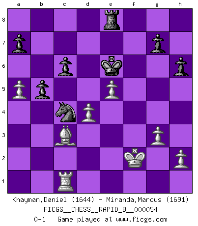 Last move : 0-1 2007 August 14 9:22:36 [Event "FICGS__CHESS__RAPID_B__000054"] [Site "FICGS"] [Date "2007.05.31"] [Round "1"] [White "Khayman,Daniel"] [Black "Miranda,Marcus"] [Result "0-1"] [WhiteElo "1644"] [BlackElo "1691"] 1.b4 e5 2.Bb2 Bxb4 3.Bxe5 Nf6 4.Nf3 Nc6 5.Bb2 d5 6.e3 O-O 7.c4 Be6 8.cxd5 Bxd5 9.Be2 Ne4 10.O-O Rb8 11.d3 Ng5 12.a3 Nxf3+ 13.Bxf3 Ba5 14.Nd2 Bxd2 15.Bxd5 Qxd5 16.Qxd2 Rbd8 17.Qc3 f6 18.d4 f5 19.Rac1 Rfe8 20.Qc4 Rd7 21.Qxd5+ Rxd5 22.Ba1 Rc8 23.f3 Na5 24.e4 Rd7 25.Bc3 Nc4 26.a4 c6 27.Rfe1 fxe4 28.fxe4 Re8 29.g3 b5 30.a5 Rde7 31.e5 Kf7 32.Re4 Ke6 33.Rh4 h6 34.Rf4 Rf7 35.Rxf7 Kxf7 36.Kf2 Ke6 0-1 Polish (Sokolsky) opening Kingside Castling by player Black (move 6) Kingside Castling by player White (move 10) Player Black won this chess game. Follow this game move after move (download)It is always better to sacrifice your opponent's men. (Savielly Tartakower) Ich war zu klein für die Schach-Schülermannschaft! (Woody Allen) El estómago es una parte esencial del maestro de Ajedrez. (Bent Larsen) Votre prénom est 'Tactique', votre deuxième prénom est 'Tactique' et votre nom est 'Tactique'. (Ken Smith) I think your argument is specious - I think your tie is ugly. (Gregory House to Dr. Foreman, House M.D.)