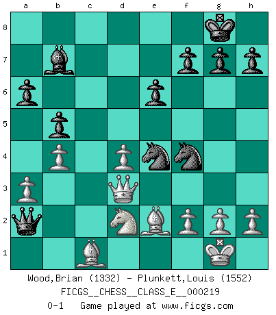 Last move : 0-1 2019 March 22 9:8:17 [Event "FICGS__CHESS__CLASS_E__000219"] [Site "FICGS"] [Date "2019.01.30"] [Round "1"] [White "Wood,Brian"] [Black "Plunkett,Louis"] [Result "0-1"] [WhiteElo "1332"] [BlackElo "1552"] 1.e4 c5 2.c3 d5 3.exd5 Qxd5 4.d4 Nc6 5.Nf3 cxd4 6.cxd4 e6 7.Nc3 Bb4 8.Bd2 Bxc3 9.Bxc3 Nf6 10.Be2 O-O 11.O-O a6 12.a3 b5 13.b4 Bb7 14.Qd3 Ne7 15.Rac1 Ng6 16.Be1 Rac8 17.Rxc8 Rxc8 18.Bd2 Qa2 19.Rc1 Rxc1+ 20.Bxc1 Ne4 21.Nd2 Nf4 0-1 Sicilian : Alapin's variation (2.c3) Kingside Castling by player Black (move 10) Kingside Castling by player White (move 11) Player Black won this chess game. Follow this game move after move (download)The passed pawn is a criminal, who should be kept under lock and key. Mild measures, such as police surveillance, are not sufficient. (Nimzovitch) Offensichtlich kennt Kasparow nichts anderes als Schach, und ich könnte 500 weitere Spieler dieser Sorte benennen. (Judith Polgar) El juego de Fischer siempre fue nítido, racional y brillante. Uno de los mejores por siempre. (Dave Regis) Karpov est une pièce de musée. (Garry Kasparov) There will be no order, only chaos. (Sol Robeson in Pi by Darren Aronofsky)