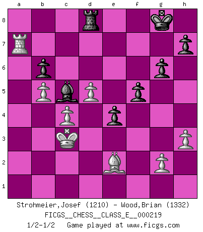 Last move : 1/2-1/2 2019 May 24 9:2:6 [Event "FICGS__CHESS__CLASS_E__000219"] [Site "FICGS"] [Date "2019.01.30"] [Round "1"] [White "Strohmeier,Josef"] [Black "Wood,Brian"] [Result "1/2-1/2"] [WhiteElo "1210"] [BlackElo "1332"] 1.e4 c5 2.Nf3 e6 3.d4 cxd4 4.Nxd4 Nf6 5.Nc3 Nc6 6.Bg5 Be7 7.Qd2 O-O 8.Be2 a6 9.O-O-O d5 10.f3 dxe4 11.fxe4 Nxd4 12.Qxd4 Qxd4 13.Rxd4 e5 14.R4d1 Be6 15.h3 Rfd8 16.a3 Kf8 17.Bxf6 Bxf6 18.Nd5 Bxd5 19.Rxd5 Rxd5 20.exd5 Rd8 21.Rd1 e4 22.c4 a5 23.b4 axb4 24.axb4 Bc3 25.b5 f5 26.Kc2 Be5 27.Kb3 b6 28.Rf1 g6 29.Rd1 Bd6 30.Ra1 Bc5 31.Ra7 Kg8 32.Kc3 1/2-1/2 Sicilian : Anderssen variation Kingside Castling by player Black (move 7) Queenside Castling by player White (move 9) This chess game ended in a draw. Follow this game move after move (download)Morphy was probably the greatest genius of them all. (Bobby Fischer) Der Bart als Geschlechtszeichen mitten im Gesicht ist obszön. Daher gefällt er den Weibern. [Zugegeben, kein Schachzitat, aber unglaublich originell] (Arthur Schopenhauer) Cuando le juegas a Fischer, no es una cuestion de si vas a ganar o perder. Es una cuestion de si vas a sobrevivir. (Boris Spassky) Tous ces prétendus hommes politiques sont les pions, les Cavaliers, les Tours ou les Fous d'une partie d'échecs qui se jouera tant qu'un hasard ne renversera pas l'échiquier. (Honoré de Balzac) Two beer, or not two beer. (Unknown)