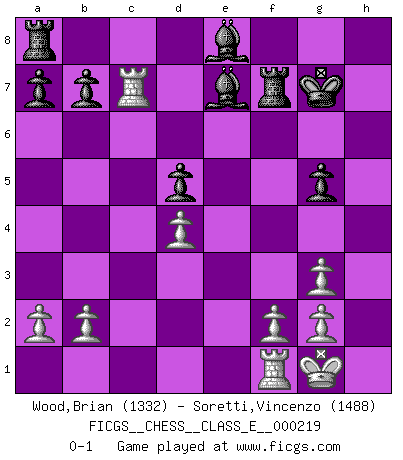 Last move : 0-1 2019 March 21 5:42:26 [Event "FICGS__CHESS__CLASS_E__000219"] [Site "FICGS"] [Date "2019.01.30"] [Round "1"] [White "Wood,Brian"] [Black "Soretti,Vincenzo"] [Result "0-1"] [WhiteElo "1332"] [BlackElo "1488"] 1.Nf3 d5 2.d4 Nf6 3.c4 e6 4.Nc3 Be7 5.Bg5 O-O 6.e3 Nbd7 7.Rc1 dxc4 8.Bxc4 Nb6 9.Bb3 h6 10.Bh4 Bd7 11.O-O g5 12.Bg3 Nh5 13.Ne5 Nxg3 14.hxg3 Be8 15.Qh5 Kg7 16.Ne4 f6 17.Nxg5 hxg5 18.Qf3 fxe5 19.Qg4 exd4 20.Qxd4+ Qxd4 21.exd4 Nd5 22.Bxd5 exd5 23.Rxc7 Rf7 0-1 Reti Opening Kingside Castling by player Black (move 5) Kingside Castling by player White (move 11) Player Black won this chess game. Follow this game move after move (download)The essence of Chess is thinking about what Chess is. (David Bronstein) Herr Iljumschinow ist ein etwas merkwürdiger Geschäftsmann: Er arbeitet zusammen mit Leuten wie Muammar al-Gaddafi; früher ist das Saddam Hussein gewesen. (Joel Lautier) Todo se encuentra en un estado de flujo y esto incluye al mundo del Ajedrez. (Mikhail Botvinnik) Roi des jeux et jeu des rois, les échecs portent en eux un sentiment d'infini. Ils donnent à celui qui s'est efforcé d'en approfondir les arcanes l'impression de n'être pas à la mesure de l'homme; en fait, ils constituent un résumé de l'univers, un microcosme, et figurent cette grande échelle qui, dans les plans de la lumière descend jusqu'à la matière, qui des abîmes insondables remonte jusqu'en l'infini de Dieu. (Pyrame) Even the best needles are not sharp at both ends. (Chinese proverb)