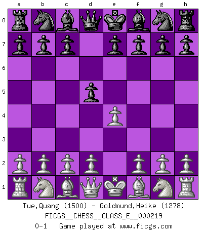 Last move : 0-1 2019 March 12 10:53:33 [Event "FICGS__CHESS__CLASS_E__000219"] [Site "FICGS"] [Date "2019.01.30"] [Round "1"] [White "Tue,Quang"] [Black "Goldmund,Heike"] [Result "0-1"] [WhiteElo "1500"] [BlackElo "1278"] 1.e4 d5 0-1 This chess game has been lost on time (started : 2019.01.30 15:21:35) Scandinavian (centre counter) defense Player Black won this chess game. Follow this game move after move (download)Adequate compensation for a sacrifice is having a sound combination leading to a winning position; adequate compensation for a blunder is having your opponent snatch defeat from the jaws of victory. (Bruce A. Moon) Schach ist gnadenlos. Du mußt bereit sein zu töten. (Nigel Short) Cuando tengo las piezas blancas, yo gano porque soy blanco; Cuando tengo las piezas negras, yo gano porque soy Bogolyubov. (Bogolyubov) Le jeu d'échecs est comme rejeté hors du temps. (Antoine de Saint-Exupéry) Strategy without tactics is the slowest route to victory. Tactics without strategy is the noise before defeat. (Sun Tzu)