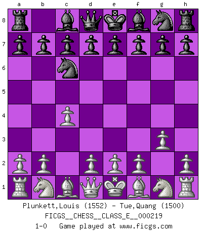 Last move : 1-0 2019 March 12 10:53:33 [Event "FICGS__CHESS__CLASS_E__000219"] [Site "FICGS"] [Date "2019.01.30"] [Round "1"] [White "Plunkett,Louis"] [Black "Tue,Quang"] [Result "1-0"] [WhiteElo "1552"] [BlackElo "1500"] 1.c4 Nc6 2.g3 1-0 This chess game has been lost on time (started : 2019.01.30 15:21:35) English Opening Player White won this chess game. Follow this game move after move (download)After a bad opening, there is hope for the middle game. After a bad middle game, there is hope for the endgame. But once you are in the endgame, the moment of truth has arrived. (Edmar Mednis) Bogoljubow: Matt in vier Zügen! Tartakower: Ich verbitte mir jede Belästigung! (Savielly Grigorievitsch Tartakower) Muchos se han convertido en Maestros de Ajedrez, nadie se ha convertido en el Maestro del Ajedrez. (Siegbert Tarrasch) Le thème de l'attaque double intervient d'une manière ou d'une autre dans l'immense majorité des combinaisons. (Youri Averbakh) There are 10 types of people in this world: those who understand binary and those who don't. (Anonymous)