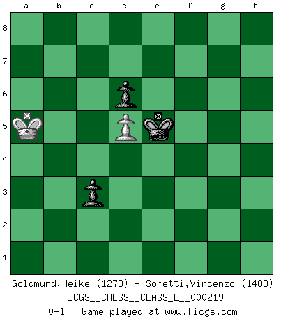 Last move : 0-1 2019 June 2 16:23:46 [Event "FICGS__CHESS__CLASS_E__000219"] [Site "FICGS"] [Date "2019.01.30"] [Round "1"] [White "Goldmund,Heike"] [Black "Soretti,Vincenzo"] [Result "0-1"] [WhiteElo "1278"] [BlackElo "1488"] 1.b4 e5 2.Bb2 d6 3.c4 Nf6 4.e3 Be7 5.Nf3 O-O 6.Be2 Nbd7 7.O-O Re8 8.d3 Nf8 9.a3 Ng6 10.Nbd2 Bg4 11.h3 Bxf3 12.Nxf3 Qd7 13.Qc2 Bf8 14.Nh2 h6 15.Ng4 Nxg4 16.Bxg4 f5 17.Bh5 Re6 18.d4 Rf6 19.Rad1 e4 20.d5 Ne5 21.f4 exf3 22.Bxf3 Re8 23.Be2 Qf7 24.Rf4 g5 25.Rf2 h5 26.Rdf1 f4 27.exf4 gxf4 28.Bd3 Nxd3 29.Qxd3 Re3 30.Qd4 Bg7 31.Rxf4 Rxf4 32.Qxf4 Qxf4 33.Rxf4 Bxb2 34.a4 Re5 35.Kf2 Kg7 36.Kf3 Bc1 37.Rh4 Kg6 38.g4 Bd2 39.gxh5+ Rxh5 40.Rg4+ Kf7 41.Kg3 Bxb4 42.Rf4+ Kg6 43.Rg4+ Rg5 44.h4 Rxg4+ 45.Kxg4 Bd2 46.h5+ Kf6 47.a5 Bxa5 48.h6 Kg6 49.h7 Kxh7 50.Kf5 Kg7 51.Ke6 Kg6 52.Kd7 Kf6 53.Kc8 b6 54.Kb7 Ke5 55.Kxc7 a6 56.Kb7 b5 57.Kxa6 bxc4 58.Kxa5 c3 0-1 Polish (Sokolsky) opening Kingside Castling by player Black (move 5) Kingside Castling by player White (move 7) 10 pieces endgame at move 47 : White KPPP , Black KBPPPP WHITE : King + 3 Pawns BLACK : King + 1 Bishop 4 Pawns 9 pieces endgame at move 49 : White KPP , Black KBPPPP WHITE : King + 2 Pawns BLACK : King + 1 Bishop 4 Pawns 8 pieces endgame at move 55 : White KPP , Black KBPPP WHITE : King + 2 Pawns BLACK : King + 1 Bishop 3 Pawns 7 pieces endgame at move 57 : White KPP , Black KBPP WHITE : King + 2 Pawns BLACK : King + 1 Bishop 2 Pawns 6 pieces endgame at move 57 : White KP , Black KBPP WHITE : King + 1 Pawn BLACK : King + 1 Bishop 2 Pawns 5 pieces endgame at move 58 : White KP , Black KPP WHITE : King + 1 Pawn BLACK : King + 2 Pawns Player Black won this chess game. Follow this game move after move (download)I am the best player in the world and I am here to prove it. (Bobby Fischer) Ich könnte leicht behaupten: Ja,ja, Leonid Breschnew wollte nicht, daß ich Weltmeister werde. In der Tat war die Sache komplizierter. (Viktor Kortschnoi) La enorme capacidad mental, en la que sin ella no puede un jugador de Ajedrez existir, es demasiado requerida por el Ajedrez al grado de que nunca podrá liberar su mente de este juego. (Albert Einstein) Le pion, dans sa simplicité, marche droit devant lui, mais lorsqu'il prend, il le fait obliquement? Ainsi l'homme, tant qu'il reste pauvre, marche dans la droiture et vit honnêtement, mais lorsqu'il recherche les honneurs, il flatte, se parjure et, par les voies obliques, cherche une position supérieure sur l'échiquier du monde. (Jean de Galles) To send light into the darkness of men's hearts - such is the duty of the artist. (Schumann)