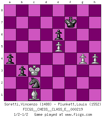 Last move : 1/2-1/2 2019 April 22 20:13:48 [Event "FICGS__CHESS__CLASS_E__000219"] [Site "FICGS"] [Date "2019.01.30"] [Round "1"] [White "Soretti,Vincenzo"] [Black "Plunkett,Louis"] [Result "1/2-1/2"] [WhiteElo "1488"] [BlackElo "1552"] 1.d4 d5 2.Nf3 Nc6 3.c4 e6 4.e3 Nf6 5.Nc3 Be7 6.Bd3 a6 7.O-O O-O 8.a3 h6 9.b4 dxc4 10.Bxc4 b5 11.Bd3 Bb7 12.Bb2 Re8 13.Qc2 Bd6 14.Ne4 Nxe4 15.Bxe4 Qd7 16.Ne5 Bxe5 17.dxe5 Nd8 18.Rad1 Qc8 19.Bxb7 Nxb7 20.Rc1 Re7 21.Rfd1 Qe8 22.Qe4 Rb8 23.Rd2 Rd7 24.Rcd1 Rbd8 25.Rxd7 Rxd7 26.Rxd7 Qxd7 27.Qd4 Qc8 28.f4 c5 29.bxc5 Qxc5 30.Qxc5 Nxc5 31.Bc3 Ne4 32.Bb4 g5 33.g3 Kg7 34.Kg2 Kg6 35.Kf3 f5 36.exf6 Nxf6 37.h3 Nd5 38.Ba5 Nf6 39.fxg5 hxg5 40.g4 Kf7 41.Bd8 Kg6 42.e4 Nd7 43.Ke3 Ne5 44.Kf2 Nc4 45.Be7 a5 46.Ke2 Kf7 47.Bxg5 Nxa3 48.h4 b4 49.Kd3 b3 50.Kc3 a4 51.Bc1 Nc2 52.e5 1/2-1/2 Queen's pawn game, Chigorin variation Kingside Castling by player White (move 7) Kingside Castling by player Black (move 7) 10 pieces endgame at move 47 : White KBPPP , Black KNPPP WHITE : King + 1 Bishop 3 Pawns BLACK : King + 1 Knight 3 Pawns This chess game ended in a draw. Follow this game move after move (download)Fischer was a master of clarity and a king of artful positioning. His opponents would see where he was going but were powerless to stop him. (Bruce Pandolfini) Wenn Du nicht kämpfst, um anderen etwas zu beweisen, sondern nur für Dich selbst, dann bist du fast unbesiegbar. (Garry Kasparov) Si un gobernante no entiende al Ajedrez, ¿como puede governar él un reinado?. (El Rey Khusros II) Même un GMI sait rarement calculer sur plus de cinq coups une attaque à sacrifices. (Rudolf Spielmann) Crush them ! Make them suffer ! (General Grievous in Star Wars ep.3)