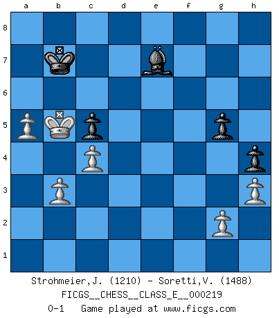 Last move : 0-1 2019 June 23 22:50:35 [Event "FICGS__CHESS__CLASS_E__000219"] [Site "FICGS"] [Date "2019.01.30"] [Round "1"] [White "Strohmeier,Josef"] [Black "Soretti,Vincenzo"] [Result "0-1"] [WhiteElo "1210"] [BlackElo "1488"] 1.e4 c5 2.Nf3 Nc6 3.d4 cxd4 4.Nxd4 d6 5.Nc3 Nf6 6.Bb5 Bd7 7.O-O g6 8.h3 Bg7 9.Re1 O-O 10.Be3 a6 11.Bxc6 bxc6 12.Qd2 c5 13.Nde2 h5 14.Rad1 Kh7 15.f3 Rb8 16.b3 Qc8 17.Nd5 Nxd5 18.Qxd5 Be6 19.Qg5 f6 20.Qf4 g5 21.Qg3 h4 22.Qf2 Bh6 23.c4 f5 24.exf5 Rxf5 25.Nc3 Qc6 26.Bc1 Qd7 27.Qe2 Rf6 28.Qe4+ Kg7 29.Nd5 Bxd5 30.Rxd5 e6 31.Rd3 Qe7 32.Rd5 e5 33.Qg4 Rg6 34.Red1 Rd8 35.Bb2 Kf7 36.Qf5+ Rf6 37.Qe4 Ke8 38.Bxe5 Re6 39.Bxd6 R8xd6 40.Rxd6 Rxe4 41.fxe4 Bg7 42.Rd8+ Qxd8 43.Rxd8+ Kxd8 44.Kf2 Be5 45.Kf3 Ke7 46.Kg4 Bf4 47.Kf5 Kf7 48.e5 a5 49.a4 Be3 50.e6+ Ke7 51.Ke5 Bf4+ 52.Kd5 Bd6 53.Kc6 Kxe6 54.Kb6 Kd7 55.Kxa5 Kc7 56.Kb5 Kb7 57.a5 Be7 0-1 Sicilian defense Kingside Castling by player White (move 7) Kingside Castling by player Black (move 9) Player Black won this chess game. Follow this game move after move (download)When you play Bobby, it is not a question if you win or lose. It is a question if you survive. (Boris Spassky) Der Freibauer hat für mich eine Seele, genau wie der Mensch, Wünsche, die unerkannt in ihm schlummern, und Befürchtungen, von deren Existenz er selbst kaum ahnt. (Aaron Nimzowitsch) No puedes jugar al Ajedrez si eres de corazón noble. (Proverbio Francés) Un footballeur joue avec ses pieds, parfois avec sa tête. Un joueur d'échecs ne joue qu'avec sa tête. Et quand il ne joue plus, il meurt. (Jacob Murray) Ah, beer! The cause of, and the solution to, all of life's problems. (Homer Simpson)