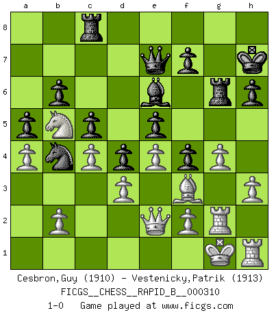 Last move : 1-0 2019 May 24 9:54:30 [Event "FICGS__CHESS__RAPID_B__000310"] [Site "FICGS"] [Date "2019.02.02"] [Round "1"] [White "Cesbron,Guy"] [Black "Vestenicky,Patrik"] [Result "1-0"] [WhiteElo "1910"] [BlackElo "1913"] 1.Nf3 Nf6 2.g3 c5 3.Bg2 d5 4.O-O Nc6 5.d3 e5 6.Nbd2 Be7 7.e4 Be6 8.Qe2 O-O 9.c3 d4 10.c4 Bd6 11.Nh4 Re8 12.Rd1 h6 13.Nf5 Bf8 14.Nb3 b6 15.h3 Rb8 16.a4 a5 17.Nd2 Qd7 18.Qf3 Kh7 19.Nb1 Ng8 20.Na3 g6 21.g4 Qd8 22.Ng3 Be7 23.Nb5 Bg5 24.Rf1 Nb4 25.Qd1 Bxc1 26.Rxc1 Ne7 27.Qd2 g5 28.Nh5 Ng6 29.Bf3 Rg8 30.Kh2 Nf4 31.Nxf4 gxf4 32.Rh1 Rc8 33.Rcg1 Qe7 34.Rg2 Rg7 35.Qe2 Rg6 36.Kg1 1-0 This chess game has been lost on time (started : 2019.02.02 1:52:15) Reti Opening Kingside Castling by player White (move 4) Kingside Castling by player Black (move 8) Player White won this chess game. Follow this game move after move (download)Methodical thinking is of more use in Chess than inspiration. (C. J. S. Purdy) Schach wird sich dank seiner hohen kulturellen Tradition immer durchsetzen. In näherer Zukunft womöglich sogar als Gegenreaktion auf die maßlose Reizüberflutung im Freizeit- und Spielbereich. (Garry Kasparov) Muchos se han convertido en Maestros de Ajedrez, nadie se ha convertido en el Maestro del Ajedrez. (Siegbert Tarrasch) On croit qu'il y a plus de mauvais joueurs que de bons joueurs, c'est faux : Il y a autant de joueurs qui gagnent que de joueurs qui perdent. (Philippe Geluck) Now the reason the enlightened prince and the wise general conquer the enemy whenever they move and their achievements surpass those of ordinary men is foreknowledge. (Sun Tzu)