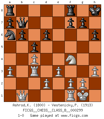 Last move : 1-0 2019 July 2 11:27:16 [Event "FICGS__CHESS__CLASS_B__000299"] [Site "FICGS"] [Date "2019.02.04"] [Round "1"] [White "Ashrod,Kristine"] [Black "Vestenicky,Patrik"] [Result "1-0"] [WhiteElo "1800"] [BlackElo "1913"] 1.b4 e5 2.Bb2 Bxb4 3.Bxe5 Nf6 4.e3 Be7 5.c4 c5 6.Nc3 Nc6 7.Bxf6 Bxf6 8.Nge2 d6 9.Rc1 Bg4 10.Qc2 O-O 11.Nf4 Nb4 12.Qb3 Bxc3 13.Rxc3 b6 14.h3 Bc8 15.a3 Na6 16.Bd3 Bb7 17.Qb1 h6 18.Bh7+ Kh8 19.Be4 Qe7 20.Bxb7 Qxb7 21.O-O 1-0 This chess game has been lost on time (started : 2019.02.04 10:8:16) Polish (Sokolsky) opening Kingside Castling by player Black (move 10) Kingside Castling by player White (move 21) Player White won this chess game. Follow this game move after move (download)Chess is life. (Bobby Fischer) Wenn Schach ein enormer Dschungel ist, der seine Myriaden von Geheimnissen nicht preisgeben will, dann sind Computer die Kettensägen einer gewaltigen ökologisch unsensiblen Nutzholzfirma. (Nigel Short) Aquellos que dicen que entienden al Ajedrez, no entienden nada. (Robert Hubner) Mon pion favori sur ma case favorite ! Bronstein en parlant d'un coup de pion en h5 quand il avait les Noirs. The Internet is the first thing that humanity has build that humanity doesn't understand, the largest experiment in anarchy that we have ever had. (Eric Schmidt)