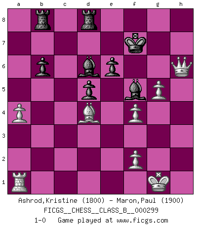 Last move : 1-0 2019 March 28 15:51:5 [Event "FICGS__CHESS__CLASS_B__000299"] [Site "FICGS"] [Date "2019.02.04"] [Round "1"] [White "Ashrod,Kristine"] [Black "Maron,Paul"] [Result "1-0"] [WhiteElo "1800"] [BlackElo "1900"] 1.b4 Nf6 2.Bb2 e6 3.a3 d5 4.e3 Bd6 5.c4 c6 6.Nf3 Nbd7 7.d4 dxc4 8.Bxc4 a5 9.bxa5 Qxa5+ 10.Nbd2 O-O 11.O-O b6 12.e4 Be7 13.a4 Bb7 14.Re1 Qh5 15.Nf1 Bb4 16.Re3 Qa5 17.N3d2 Rfd8 18.Rg3 Qh5 19.Be2 Qh6 20.Rh3 Qg5 21.Bd3 h6 22.e5 Nd5 23.Ne4 Qe7 24.Rg3 f5 25.exf6 N7xf6 26.Nxf6+ Qxf6 27.Ne3 Bd6 28.Ng4 Qh4 29.Rh3 Qe7 30.Nxh6+ gxh6 31.Rxh6 Nf4 32.d5 Qg5 33.Rh8+ Kf7 34.Rh7+ Kf8 35.Qf3 cxd5 36.g3 Rab8 37.Bg7+ Kg8 38.Bd4 Ba6 39.h4 Bxd3 40.hxg5 Bxh7 41.gxf4 Kf7 42.Qh3 Bf5 43.Qh6 1-0 Polish (Sokolsky) opening Kingside Castling by player Black (move 10) Kingside Castling by player White (move 11) Player White won this chess game. Follow this game move after move (download)If Chess is a science, it's a most inexact one. If Chess is an art, it is too exacting to be seen as one. If Chess is a sport, it's too esoteric. If Chess is a game, it's too demanding to be just a game. If Chess is a mistress, she's a demanding one. If Chess is a passion, it's a rewarding one. If Chess is life, it's a sad one. (Unknown) Mutter, ich bin eben Ex-Weltmeister geworden. --beim nach Hause Kommen nach dem Verlust des WM-Titels an Mihail Botvinnik -- (Mikhail Nekhemyevich Tal) El jugador táctico debe saber que hacer cuando algo se debe de hacer. El estratégico debe saber que hacer cuando nada se debe de hacer. (Savielly Tartakover) On est toujours la mazette de quelqu'un d'autre. (Anonyme) The only sure thing about luck is that it will change. (Wilson Mizner)