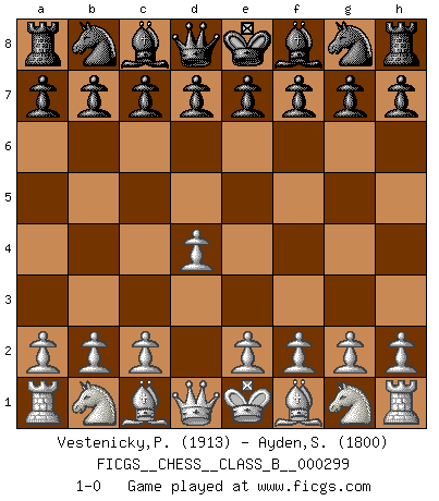 Last move : 1-0 2019 March 16 11:14:0 [Event "FICGS__CHESS__CLASS_B__000299"] [Site "FICGS"] [Date "2019.02.04"] [Round "1"] [White "Vestenicky,Patrik"] [Black "Ayden,Stevemark"] [Result "1-0"] [WhiteElo "1913"] [BlackElo "1800"] 1.d4 1-0 This chess game has been lost on time (started : 2019.02.04 10:8:16) Queen's pawn Player White won this chess game. Follow this game move after move (download)Whoever sees no other aim in the game than that of giving checkmate to one's opponent will never become a good Chess player. (Euwe) Wer sich die Fähigkeit anerziehen will im Schach selbstständig zu denken, der muß alles meiden, was leblos ist: ausgeklügelte Theorien, die sich auf sehr wenige Beispiele und eine Menge Hirngespinste stützen. (Emanuel Lasker) Bobby es la celebridad menos entendida y malinterpretada que camina el la faz de esta tierra. (Yasser Seirawan) Il s'avisa de me proposer d'apprendre les échecs qu'il jouait un peu... me voilà forcené des échecs. J'achète un échiquier, je m'enferme dans ma chambre, j'y passe des jours et des nuits à vouloir apprendre par cur toutes les parties. (Jean-Jacques Rousseau, Confessions) Knowledge will give you power, but character respect. (Bruce Lee)