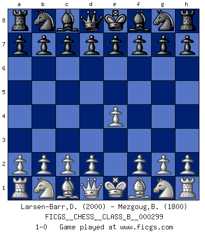 Last move : 1-0 2019 March 16 11:14:0 [Event "FICGS__CHESS__CLASS_B__000299"] [Site "FICGS"] [Date "2019.02.04"] [Round "1"] [White "Larsen-Barr,Daniel"] [Black "Mezgoug,Buchekkouh"] [Result "1-0"] [WhiteElo "2000"] [BlackElo "1800"] 1.e4 1-0 This chess game has been lost on time (started : 2019.02.04 10:8:16) King's pawn Opening Player White won this chess game. Follow this game move after move (download)Pawn endings are to Chess what putting is to golf. (Cecil Purdy) Lisa Lane, amerikanische Schachmeisterin, hatte Fischer einmal als stärksten lebenden Spieler bezeichnet. Antwort: Das ist richtig, aber Lisa Lane ist eigentlich nicht in der Lage, das zu beurteilen. (Robert James Fischer) Los problemas de Ajedrez exigen del compositor las mismas virtudes que caracterizan todo el arte de valor: originalidad, invención, concisión, armonía, complejidad e insinceridad explendida. (Vladimir Nabokov) Je ne crois pas en la psychologie, je crois aux bons coups. (Robert Fischer) We need strong personalities and only one world champion to attract sponsors. (Anatoly Karpov)