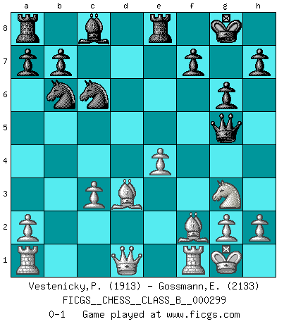 Last move : 0-1 2019 May 5 7:24:54 [Event "FICGS__CHESS__CLASS_B__000299"] [Site "FICGS"] [Date "2019.02.04"] [Round "1"] [White "Vestenicky,Patrik"] [Black "Gossmann,Ewald"] [Result "0-1"] [WhiteElo "1913"] [BlackElo "2133"] 1.d4 Nf6 2.c4 g6 3.f3 d5 4.cxd5 Nxd5 5.e4 Nb6 6.Be3 Bg7 7.Nc3 O-O 8.Bf2 e5 9.d5 c6 10.Nge2 cxd5 11.exd5 Re8 12.Ng3 e4 13.fxe4 Bxc3+ 14.bxc3 Qxd5 15.Bd3 Nc6 16.O-O Qg5 0-1 This chess game has been lost on time (started : 2019.02.04 10:8:16) King's Indian defense Kingside Castling by player Black (move 7) Kingside Castling by player White (move 16) Player Black won this chess game. Follow this game move after move (download)The older I grow, the more I value pawns. (Paul Keres) Rauchen ist dem Schachspieler bei seiner Arbeit, also im Wettkampf, untersagt. (Viktor Kortschnoi) Ciertamente el estado mental actual de Bobby Fischer es una tragedia. Uno de los mas grandes jugadores de Ajedrez del mundo -el orgullo y pena del Ajedrez Americano. (Frank Brady) Si rien de grave n'est détecté lors de l'analyse d'une position, on joue alors le coup. Seconde règle de Blumenfeld. It is a good thing for an uneducated man to read books of quotations. (Winston Churchill)