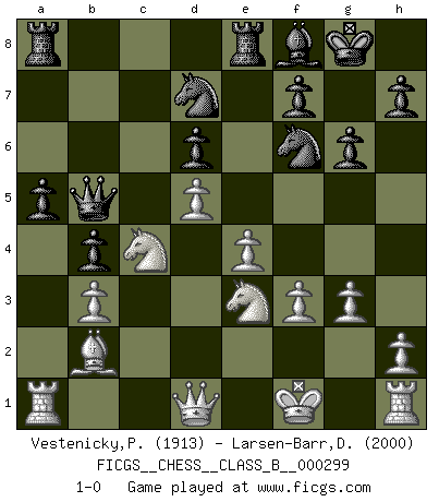 Last move : 1-0 2019 May 11 20:20:6 [Event "FICGS__CHESS__CLASS_B__000299"] [Site "FICGS"] [Date "2019.02.04"] [Round "1"] [White "Vestenicky,Patrik"] [Black "Larsen-Barr,Daniel"] [Result "1-0"] [WhiteElo "1913"] [BlackElo "2000"] 1.d4 Nf6 2.c4 e6 3.g3 c5 4.d5 exd5 5.cxd5 b5 6.Nf3 d6 7.e4 b4 8.a3 Be7 9.axb4 cxb4 10.Nbd2 O-O 11.Bg2 Ba6 12.Bf1 Bxf1 13.Kxf1 Re8 14.Nd4 Qb6 15.Nf5 Bf8 16.f3 g6 17.Nc4 Qb5 18.Nfe3 a5 19.b3 Nbd7 20.Bb2 1-0 Catalan Opening Kingside Castling by player Black (move 10) Player White won this chess game. Follow this game move after move (download)I have never in my life played the French Defence, which is the dullest of all openings. (Wilhelm Steinitz) Vom Schach wurde gesagt das Leben sei dafür nicht lange genug. Aber das ist der Fehler des Lebens, nicht des Schach'. (Irving Chernev) Aquellos que dicen que entienden al Ajedrez, no entienden nada. (Robert Hubner) J'ai vu le vaincu d'Echecs jouer des années durant dans l'espoir de la fête de la victoire. Car tu es plus riche de ce qu'elle existe si même elle n'est point pour toi. Ainsi de la perle du fond des mers. (Antoine de Saint-Exupéry) Man is still the most extraordinary computer of all. (John F. Kennedy)