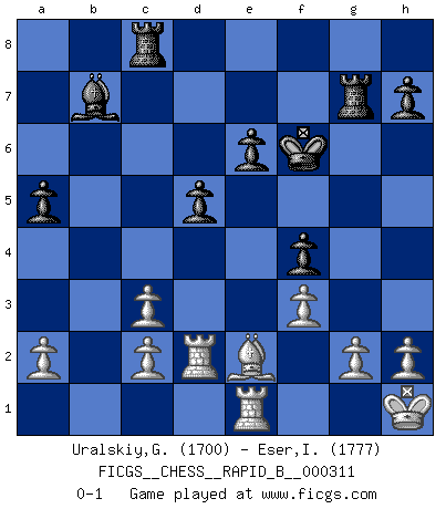 Last move : 0-1 2019 June 5 23:14:39 [Event "FICGS__CHESS__RAPID_B__000311"] [Site "FICGS"] [Date "2019.02.05"] [Round "1"] [White "Uralskiy,Georgiy"] [Black "Eser,Ipekyilmaz"] [Result "0-1"] [WhiteElo "1700"] [BlackElo "1777"] 1.e4 g6 2.d4 c6 3.Nc3 b6 4.Nf3 Bb7 5.Be2 c5 6.Be3 e6 7.Qd2 a6 8.O-O f6 9.Rfe1 f5 10.exf5 gxf5 11.Ne5 Nf6 12.dxc5 Bxc5 13.Bxc5 bxc5 14.Qd6 Qe7 15.Qc7 d6 16.Qxe7+ Kxe7 17.Nc4 Nfd7 18.Na5 Ra7 19.Nd1 Ba8 20.Ne3 f4 21.Nd1 Nc6 22.Nxc6+ Bxc6 23.f3 Ne5 24.Nf2 Rg8 25.Kh1 Kf6 26.Rad1 Rag7 27.Rg1 d5 28.Nd3 Nxd3 29.Bxd3 c4 30.Be2 Rc8 31.Rd2 a5 32.Re1 c3 33.bxc3 Bb7 0-1 This chess game has been lost on time (started : 2019.02.05 0:18:43) Robatsch (Modern) defense Kingside Castling by player White (move 8) Player Black won this chess game. Follow this game move after move (download)It is peculiar but a fact nevertheless, that gamblers in chess always have enthusiastic followers. (Botvinnik) Ich verachte Kasparow. (Viktor Kortschnoi) Los asuntos humanos son como una partida de Ajedrez: solo aquellos que no lo toman seriamente, pueden ser llamados buenos jugadores. (Hung Tzu Ch'eng) Nous vivons dans un monde échiquéen : chaque jour qui passe est un défi à relever. (Philosophe Sasha) God, you are such an idiot. - Actually, I thought I was more of a jerk. (Gregory House to Stacy Warner, House M.D.)