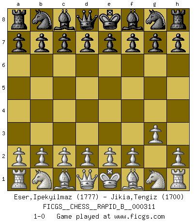 Last move : 1-0 2019 March 7 10:31:20 [Event "FICGS__CHESS__RAPID_B__000311"] [Site "FICGS"] [Date "2019.02.05"] [Round "1"] [White "Eser,Ipekyilmaz"] [Black "Jikia,Tengiz"] [Result "1-0"] [WhiteElo "1777"] [BlackElo "1700"] 1.g3 1-0 This chess game has been lost on time (started : 2019.02.05 0:18:43) Benko's Opening Player White won this chess game. Follow this game move after move (download)Mistrust is the most necessary characteristic of the Chess player. (Siegbert Tarrasch) Über die Verhaftung Bobby Fischers: Warum es die Bush-Administration für nötig befindet einen 61 Jahre alten Mann zu hetzten, der für niemanden ausser sich selbste eine Gefahr darstellt ist ein Rätsel. (Nigel Short) Los Peones son nacidos libres, y aún así, se encuentran por doquier encadenados. (Rick Kennedy) La tactique est l'élément le plus important du milieu de jeu. (Siegbert Tarrasch) Kids, you tried your best and you failed miserably. The lesson is, never try. (Simpsons)