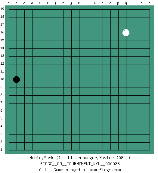 Last move : 0-1 2007 June 3 13:15:8 [Event "FICGS__GO__TOURNAMENT_KYU__000035"] [Site "FICGS"] [Date "2007.05.31"] [Round "1"] [Black "Noble,Mark"] [White "Litzenburger,Xavier"] [Result "0-1"] [Rating 2 "0841"] 1.b10 q16 0-1 Here are the names of the openings (joseki) played in the four corners : Player White won this Go (weiqi, baduk) game. Follow this game move after move (download)Good moves and bad moves are bedfellows. (Anonymous) Somehow our devils are never quite what we expect when we meet them face to face. (Nelson DeMille)