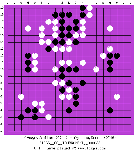 Last move : 0-1 2019 April 27 18:41:39 [Event "FICGS__GO__TOURNAMENT__000033"] [Site "FICGS"] [Date "2019.02.05"] [Round "1"] [Black "Kehayov,Yulian"] [White "Agronow,Cosmo"] [Result "0-1"] [Rating 1 "0744"] [Rating 2 "0246"] 1.c3 q16 2.q4 d16 3.d10 r6 4.k4 k7 5.k16 k14 6.q10 e5 7.d4 e10 8.d11 e11 9.d12 e12 10.j16 o10 11.q11 p12 12.q12 q13 13.r12 m16 14.l17 m17 15.l16 l15 16.k15 h15 17.k10 g3 18.k8 c6 19.e4 f4 20.e3 f5 21.j7 j8 22.j9 h8 23.l7 k6 24.m8 k11 25.l10 h10 26.j10 j11 27.l6 j6 28.l5 m11 29.l14 m15 30.j14 k13 31.j15 j13 32.h14 g14 33.g15 h16 34.g16 h17 35.j18 g17 36.g13 f14 37.j17 f16 38.h18 f15 39.m18 n18 40.m19 n19 41.k18 h13 0-1 This go game has been lost on time (started : 2019.02.05 4:50:11) Here are the names of the openings (joseki) played in the four corners : Corner q4 : q4 r6 Hoshi (Hwajeom, Seongjeom, Xingwei`) 4-4 Point. The star or hoshi (4-4) point, emphasizing influence at the potential expense of territory. Ikken Kakari (Hankan Keolch'im, Yi Gua`jiao~, 1-Space Low Approach). White 2 is the standard approach move to the 4-4. Corner d4 : c3 e5 San-San (Sam-Sam, San-San) 3-3 Point. The San-San (3-3) point, emphasizing territory at the expense of influence. Corner d16 : d16 d11 Hoshi (Hwajeom, Seongjeom, Xingwei`) 4-4 Point. The star or hoshi (4-4) point, emphasizing influence at the potential expense of territory. Corner q16 : q16 q11 Hoshi (Hwajeom, Seongjeom, Xingwei`) 4-4 Point. The star or hoshi (4-4) point, emphasizing influence at the potential expense of territory. Player White won this Go (weiqi, baduk) game. Follow this game move after move (download)There are players who don't accept exchange: they play many moves that perpetuate a previous state of the game. (Pierre Audouard) I don't know, I don't care, and it doesn't make any difference. (Albert Einstein)
