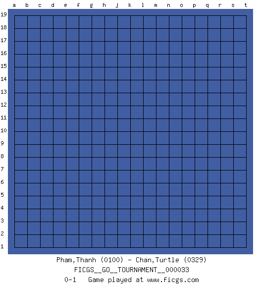 Last move : 0-1 2019 March 7 10:31:20 [Event "FICGS__GO__TOURNAMENT__000033"] [Site "FICGS"] [Date "2019.02.05"] [Round "1"] [Black "Pham,Thanh"] [White "Chan,Turtle"] [Result "0-1"] [Rating 1 "0100"] [Rating 2 "0329"] 0-1 This go game has been lost on time (started : 2019.02.05 4:50:11) Here are the names of the openings (joseki) played in the four corners : Player White won this Go (weiqi, baduk) game. Follow this game move after move (download)Keep away from thickness. (Anonymous) War is the child of passion, passion is the child of narcissism and narcissism is the child. (...) Another game ? (Thibault de Vassal)