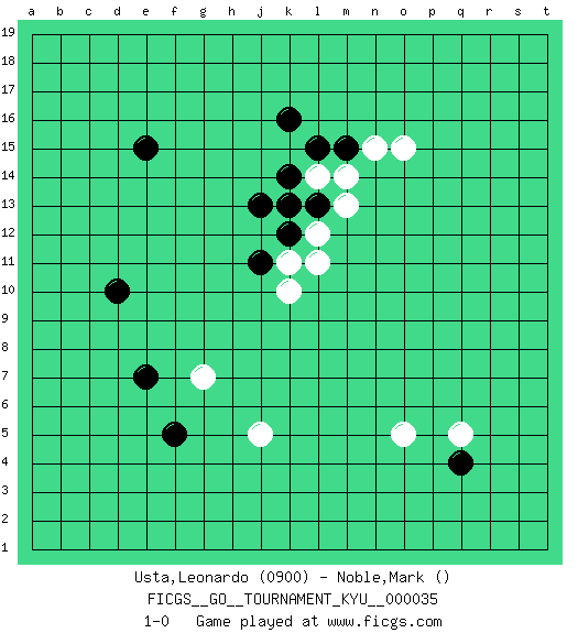 Last move : 1-0 2007 June 3 13:16:34 [Event "FICGS__GO__TOURNAMENT_KYU__000035"] [Site "FICGS"] [Date "2007.05.31"] [Round "1"] [Black "Usta,Leonardo"] [White "Noble,Mark"] [Result "1-0"] [Rating 1 "0900"] 1.d10 k10 2.f5 j5 3.k16 o15 4.q4 o5 5.e15 g7 6.e7 q5 7.j11 k11 8.k12 l11 9.l13 l12 10.j13 n15 11.m15 m14 12.l15 l14 13.k13 m13 14.k14 1-0 Here are the names of the openings (joseki) played in the four corners : Corner d4 : f5 j5 This joseki is unknown. A weak or weird move has probably been played in this corner. Corner q4 : q4 o5 Hoshi (Hwajeom, Seongjeom, Xingwei`) 4-4 Point. The star or hoshi (4-4) point, emphasizing influence at the potential expense of territory. Player Black won this Go (weiqi, baduk) game. Follow this game move after move (download)A meijin needs no joseki. (Anonymous) The project of the man are lower than those of the sky. (Chinese proverb)