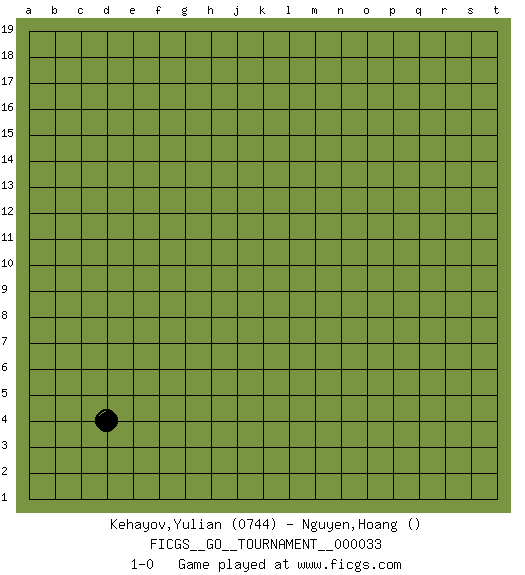 Last move : 1-0 2019 March 7 22:30:49 [Event "FICGS__GO__TOURNAMENT__000033"] [Site "FICGS"] [Date "2019.02.05"] [Round "1"] [Black "Kehayov,Yulian"] [White "Nguyen,Hoang"] [Result "1-0"] [Rating 1 "0744"] 1.d4 1-0 This go game has been lost on time (started : 2019.02.05 4:50:11) Here are the names of the openings (joseki) played in the four corners : Corner d4 : d4 1-0 Hoshi (Hwajeom, Seongjeom, Xingwei`) 4-4 Point. The star or hoshi (4-4) point, emphasizing influence at the potential expense of territory. Player Black won this Go (weiqi, baduk) game. Follow this game move after move (download)Answer the keima with a kosumi. (Anonymous) All the biggest technological inventions created by man - the airplane, the automobile, the computer - says little about his intelligence, but speaks volumes about his laziness. (Mark Kennedy)