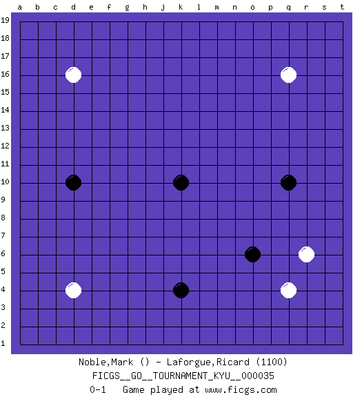 Last move : 0-1 2007 June 3 13:17:10 [Event "FICGS__GO__TOURNAMENT_KYU__000035"] [Site "FICGS"] [Date "2007.05.31"] [Round "1"] [Black "Noble,Mark"] [White "Laforgue,Ricard"] [Result "0-1"] [Rating 2 "1100"] 1.k10 d16 2.d10 d4 3.k4 q16 4.q10 q4 5.o6 r6 0-1 Here are the names of the openings (joseki) played in the four corners : Corner q4 : q4 o6 Hoshi (Hwajeom, Seongjeom, Xingwei`) 4-4 Point. The star or hoshi (4-4) point, emphasizing influence at the potential expense of territory. Player White won this Go (weiqi, baduk) game. Follow this game move after move (download)The strong player plays straight, the weak diagonally. (Anonymous) Train yourself to let go of everything you fear to lose. (Master Yoda in Star Wars ep.3)
