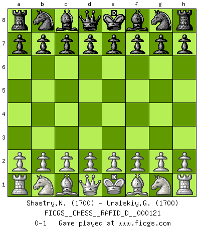 Last move : 0-1 2019 March 7 10:31:20 [Event "FICGS__CHESS__RAPID_D__000121"] [Site "FICGS"] [Date "2019.02.05"] [Round "1"] [White "Shastry,Nachiketha"] [Black "Uralskiy,Georgiy"] [Result "0-1"] [WhiteElo "1700"] [BlackElo "1700"] 0-1 This chess game has been lost on time (started : 2019.02.05 9:16:6) Player Black won this chess game. Follow this game move after move (download)Discovered check is the dive bomber of the Chessboard. (Reuben Fine) Die Elozahlen sind sehr schlecht für das Schach. Jetzt ist Schach eine Sportindustrie, die darauf zielt Elopunkte zu machen. (Miguel Najdorf) Yo creo que el Ajedrez posee una magia que es también una ayuda en la edad avanzada. Una rodilla reumática es olvidada durante una partida de Ajedrez y otros eventos pueden parecer algo sin importancia comparada a una catástrofe en el tablero de Ajedrez. (Vlastimil Hort) On n'a jamais que l'âge auquel on a commence à jouer aux échecs car après on cesse de vieillir. (Capablanca) When I took office, only high energy physicists had ever heard of what is called the World Wide Web... Now even my cat has its own page. (Bill Clinton, 1996)