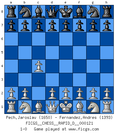 Last move : 1-0 2019 March 11 22:49:8 [Event "FICGS__CHESS__RAPID_D__000121"] [Site "FICGS"] [Date "2019.02.05"] [Round "1"] [White "Pech,Jaroslav"] [Black "Fernandez,Andres"] [Result "1-0"] [WhiteElo "1650"] [BlackElo "1393"] 1.c4 1-0 This chess game has been lost on time (started : 2019.02.05 9:16:6) English Opening Player White won this chess game. Follow this game move after move (download)When you don't know what to do, wait for your opponent to get an idea - it's sure to be wrong. (Tarrasch) Rauchen ist dem Schachspieler bei seiner Arbeit, also im Wettkampf, untersagt. (Viktor Kortschnoi) Fischer es el jugador mas fuerte del mundo. De hecho, el jugador mas fuerte que jamas haya existido. (Larry Evans) Karpov est une pièce de musée. (Garry Kasparov) Luck is what you have left over after you give 100 percent. (Langston Coleman)