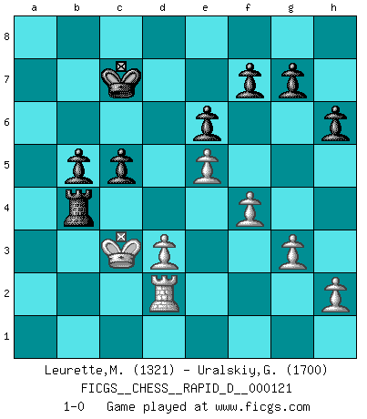 Last move : 1-0 2019 April 8 3:43:18 [Event "FICGS__CHESS__RAPID_D__000121"] [Site "FICGS"] [Date "2019.02.05"] [Round "1"] [White "Leurette,Marc-Antoine"] [Black "Uralskiy,Georgiy"] [Result "1-0"] [WhiteElo "1321"] [BlackElo "1700"] 1.e4 c6 2.d4 d5 3.Nc3 dxe4 4.Nxe4 Bf5 5.Nc3 Nf6 6.Nf3 e6 7.Bd3 Bxd3 8.Qxd3 Bd6 9.Bg5 Nbd7 10.O-O-O Qc7 11.Ne4 Bf4+ 12.Ned2 h6 13.Bxf4 Qxf4 14.g3 Qd6 15.Rhe1 O-O-O 16.Ne4 Nxe4 17.Rxe4 Kb8 18.Ne5 Nxe5 19.Rxe5 Qxe5 20.dxe5 Rxd3 21.cxd3 Rd8 22.f4 c5 23.b3 Kc7 24.Kc2 b5 25.a3 a5 26.Kc3 Rd4 27.b4 axb4+ 28.axb4 Rxb4 29.Rd2 1-0 This chess game has been lost on time (started : 2019.02.05 9:16:6) Caro-Kann : Classical variation Queenside Castling by player White (move 10) Queenside Castling by player Black (move 15) Player White won this chess game. Follow this game move after move (download)Fischer Chess play was always razor-sharp, rational and brilliant. One of the best ever. (Dave Regis) Konzentriere dich auf materielle Gewinne. Nimm, was dir dein Gegner gibt, ausser es gibt einen guten Grund der dagegenspricht. (Robert James Fischer) Los libros de Ajedrez deben de usarse igual como usamos los anteojos: para mejorar la vista, aunque algunos jugadores los quieren usar como si ellos les otorgaran la vision. (José Raúl Capablanca) Pour se monter efficace, un Cavalier a besoin d'avant-postes ! Les Cavaliers font les meilleurs bloqueurs de pions passés. True nature is revealed in times of difficulty. (Chinese proverb)
