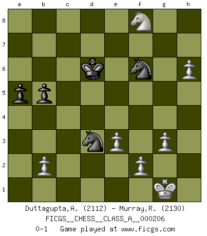 Last move : 0-1 2020 February 26 15:4:15 [Event "FICGS__CHESS__CLASS_A__000206"] [Site "FICGS"] [Date "2019.02.06"] [Round "1"] [White "Duttagupta,Aniruddha"] [Black "Murray,Russell"] [Result "0-1"] [WhiteElo "2112"] [BlackElo "2130"] 1.d4 d5 2.c4 dxc4 3.Nf3 Nf6 4.e3 e6 5.Bxc4 c5 6.O-O a6 7.dxc5 Bxc5 8.Qxd8+ Kxd8 9.Be2 Ke7 10.Nbd2 Bd7 11.Nb3 Bb6 12.Bd2 Nc6 13.Bc3 Rac8 14.Rac1 Rhg8 15.Rfd1 Ne4 16.Be1 Rgd8 17.Bd3 Nd6 18.Bxh7 g6 19.Ng5 Be8 20.h4 Nf5 21.g3 Nh6 22.Rd2 Ng4 23.Rxd8 Rxd8 24.Kf1 a5 25.Bc3 Rd5 26.Kg2 Nb4 27.Bd4 Bxd4 28.Nxd4 e5 29.Ndf3 Nd3 30.Rc7+ Rd7 31.Rxd7+ Bxd7 32.h5 Bc6 33.Nxf7 Ne1+ 34.Kf1 Nxf3 35.Bxg6 Bd5 36.h6 Nf6 37.Nh8 e4 38.Bf5 Bxa2 39.Ng6+ Kd6 40.Nf8 Bc4+ 41.Kg2 b5 42.Bxe4 Ne1+ 43.Kg1 Bd3 44.Bxd3 Nxd3 0-1 QGA : Classical, 6...a6 Kingside Castling by player White (move 6) Player Black won this chess game. Follow this game move after move (download)Why must I lose to this idiot ? (Aron Nimzovich) Später, ... hatte ich zunehmend Erfolg in entscheidenden Partien. Vielleicht weil ich eine einfache Wahrheit erkannte: nicht nur ich hatte Angst, auch mein Gegner. (Mikhail Nekhemyevich Tal) a manera como él juega al Ajedrez, demuestra la completa naturaleza de un hombre. (Stanley Ellin) Si le désir cupide (et stupide) de gagner est une inépuisable source de souffrance, une combinaison brillante sur l'échiquier est une découverte : le coquelicot qui s'épanouit lorsque apparaît la Voie Lactée. (Arrabal) Nobody is always a winner, and anybody who says he is, is either a liar or doesn't play poker. (Amarillo Slim)