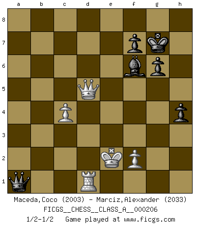 Last move : 1/2-1/2 2019 May 19 4:41:23 [Event "FICGS__CHESS__CLASS_A__000206"] [Site "FICGS"] [Date "2019.02.06"] [Round "1"] [White "Maceda,Coco"] [Black "Marciz,Alexander"] [Result "1/2-1/2"] [WhiteElo "2003"] [BlackElo "2033"] 1.e4 c5 2.Nf3 Nf6 3.e5 Nd5 4.Nc3 e6 5.Nxd5 exd5 6.d4 Nc6 7.dxc5 Bxc5 8.Qxd5 d6 9.exd6 Qb6 10.Qe4+ Be6 11.Qh4 Bxd6 12.Be2 Bf5 13.c3 O-O 14.O-O Rfe8 15.Bc4 Bg6 16.Qh3 Be7 17.Qg4 Na5 18.Bd5 Rad8 19.Qa4 Nc6 20.Bb3 Bc5 21.Bg5 Ra8 22.Bh4 Re2 23.Rad1 h6 24.Qg4 Rxb2 25.Bg3 Rxb3 26.axb3 Qxb3 27.Ne5 Nxe5 28.Bxe5 a5 29.h4 Bf8 30.h5 Bc2 31.Rd2 a4 32.Rc1 Qb5 33.R1xc2 Qxe5 34.Rc1 Be7 35.Rd7 a3 36.Qf3 Bf6 37.Qxb7 Ra5 38.Qb3 Qxh5 39.Re1 a2 40.Ra1 Rg5 41.Rxa2 Rxg2+ 42.Kxg2 Qg4+ 43.Kf1 Qh3+ 44.Ke1 Qxd7 45.Re2 Qc6 46.Re3 g6 47.c4 Kg7 48.Qb5 Qh1+ 49.Ke2 h5 50.Qd5 Qa1 51.Rd3 h4 52.Rd1 1/2-1/2 Sicilian : Nimzovich-Rubinstein; Rubinstein counter-gambit Kingside Castling by player Black (move 13) Kingside Castling by player White (move 14) This chess game ended in a draw. Follow this game move after move (download)No Chess Grandmaster is normal; they only differ in the extent of their madness. (Viktor Korchnoi) Ich verlor meine Bürgerrechte, mein Gehalt wurde mir nicht mehr bezahlt und ich wurde zensiert und durfte nicht mehr ins Ausland reisen. [nach dem Match Fischer-Taimanov 6:0] (Mark Taimanov) A la fecha, Fischer esta simplemente un nivel arriba de todos los mejores jugadores de Ajedrez del mundo. (John Jacobs) La vie est comme un jeu d'échecs : nous esquissons un plan, mais celui-ci est tributaire de ce que daignent faire l'adversaire aux échecs et le destin dans la vie. (Arthur Schopenhauer) All battles are fought by scared men who'd rather be someplace else. (John Wayne in the movie In harm's way)