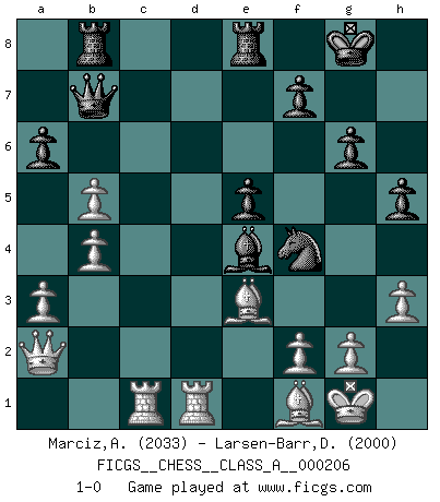 Last move : 1-0 2019 May 11 8:17:49 [Event "FICGS__CHESS__CLASS_A__000206"] [Site "FICGS"] [Date "2019.02.06"] [Round "1"] [White "Marciz,Alexander"] [Black "Larsen-Barr,Daniel"] [Result "1-0"] [WhiteElo "2033"] [BlackElo "2000"] 1.Nf3 g6 2.e4 c5 3.d4 Bg7 4.dxc5 Qa5+ 5.c3 Nf6 6.b4 Qc7 7.Bd3 O-O 8.O-O d6 9.cxd6 exd6 10.Bf4 Nh5 11.Be3 Re8 12.h3 a6 13.Nd4 Nc6 14.Nd2 Bd7 15.Qb3 b5 16.Rac1 Qb7 17.Rfe1 Rac8 18.Red1 Rcd8 19.N4f3 Ne5 20.Nxe5 Bxe5 21.c4 Nf4 22.Bf1 Bc6 23.a3 h5 24.Qa2 Rb8 25.Nf3 Bxe4 26.Nxe5 dxe5 27.cxb5 1-0 Reti Opening Kingside Castling by player Black (move 7) Kingside Castling by player White (move 8) Player White won this chess game. Follow this game move after move (download)Chess is imagination. (David Bronstein) Alles was ich jemals tun will ist Schach spielen. (Robert James Fischer) Por la belleza de sus partidas, la claridad de su juego y lo brillante de sus ideas, Fischer se creó el mismo como un artista de la misma estatura como Brahms, Rembrandt y Shakespeare. (David Levy) Aidez vos pièces, elles vous aideront. (Paul Morphy) A good aphorism is too hard for the tooth of time, and is not worn away with the centuries, although it serves as food for every speech. (Friedrich Nietzsche)
