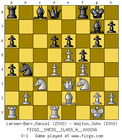 Last move : 0-1 2019 May 13 8:28:14 [Event "FICGS__CHESS__CLASS_A__000206"] [Site "FICGS"] [Date "2019.02.06"] [Round "1"] [White "Larsen-Barr,Daniel"] [Black "Walton,John"] [Result "0-1"] [WhiteElo "2000"] [BlackElo "2000"] 1.e4 c5 2.f4 g6 3.Nf3 Bg7 4.d3 Nc6 5.Be2 d6 6.O-O e6 7.c3 Nge7 8.d4 cxd4 9.cxd4 O-O 10.Be3 f5 11.e5 Nd5 12.Qd2 Nxe3 13.Qxe3 a6 14.Rd1 b5 15.a4 bxa4 16.Nc3 Nb4 0-1 Sicilian : Grand Prix attack Kingside Castling by player White (move 6) Kingside Castling by player Black (move 9) Player Black won this chess game. Follow this game move after move (download)Not only will I predict his triumph over Botvinnik, but I'll go further and say that he'll probably be the greatest Chess player that ever lived. (John Collins) Spiel ein langweiliges Spiel zu Ende und lustige Dinge können passieren. (Hans Ree) Coloca el contenido de las piezas del Ajedrez en un sombrero, agitalo vigorosamente, arrojalas en un tablero desde una altura de 30 centimetros y así obtendras el estilo de Steinitz. (H. E. Bird) Que feriez-vous si vous étiez en train de jouer aux échecs et que la fin du monde arrive ? Je continuerais à jouer. (Saint Borromée) To steal ideas from one person is plagiarism. To steal from many is research. (Unknown)